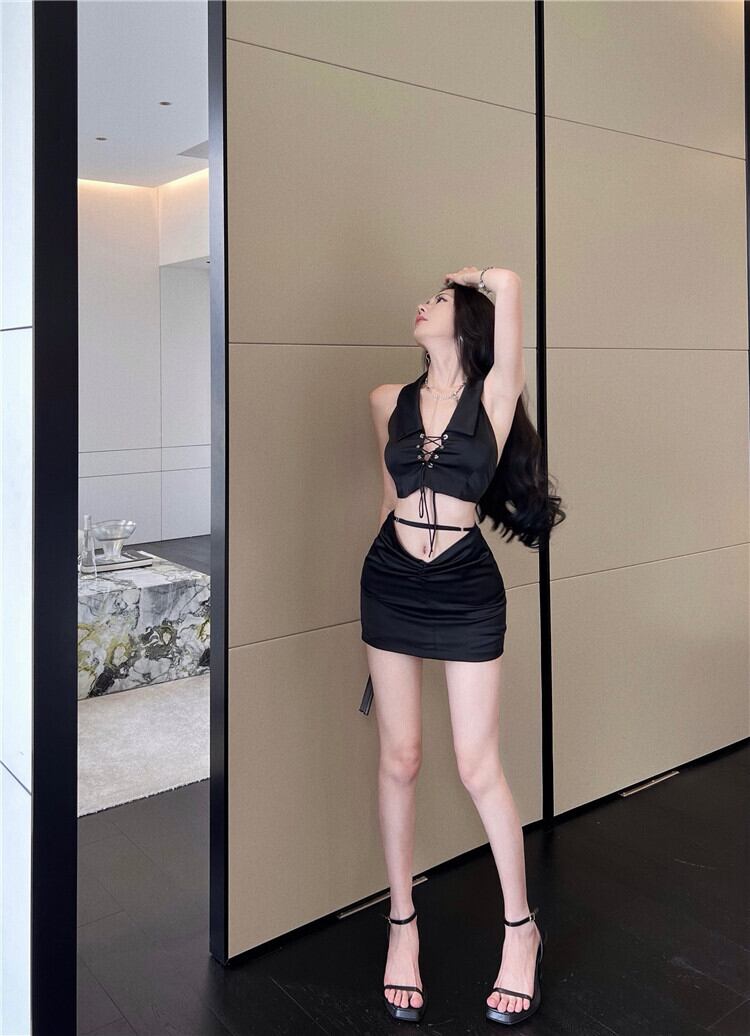 ホットガールズサマースーツのラペル背中の開いたノースリーブシャツショートトップウエストスリムミニスカートツーピースセット服 夏物