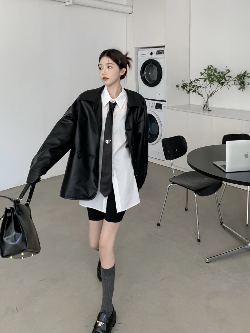 襟レザーコート冬服原宿長袖黒ルーズレディースボタントップス ロング ブラック かわいい ウィンター 冬物