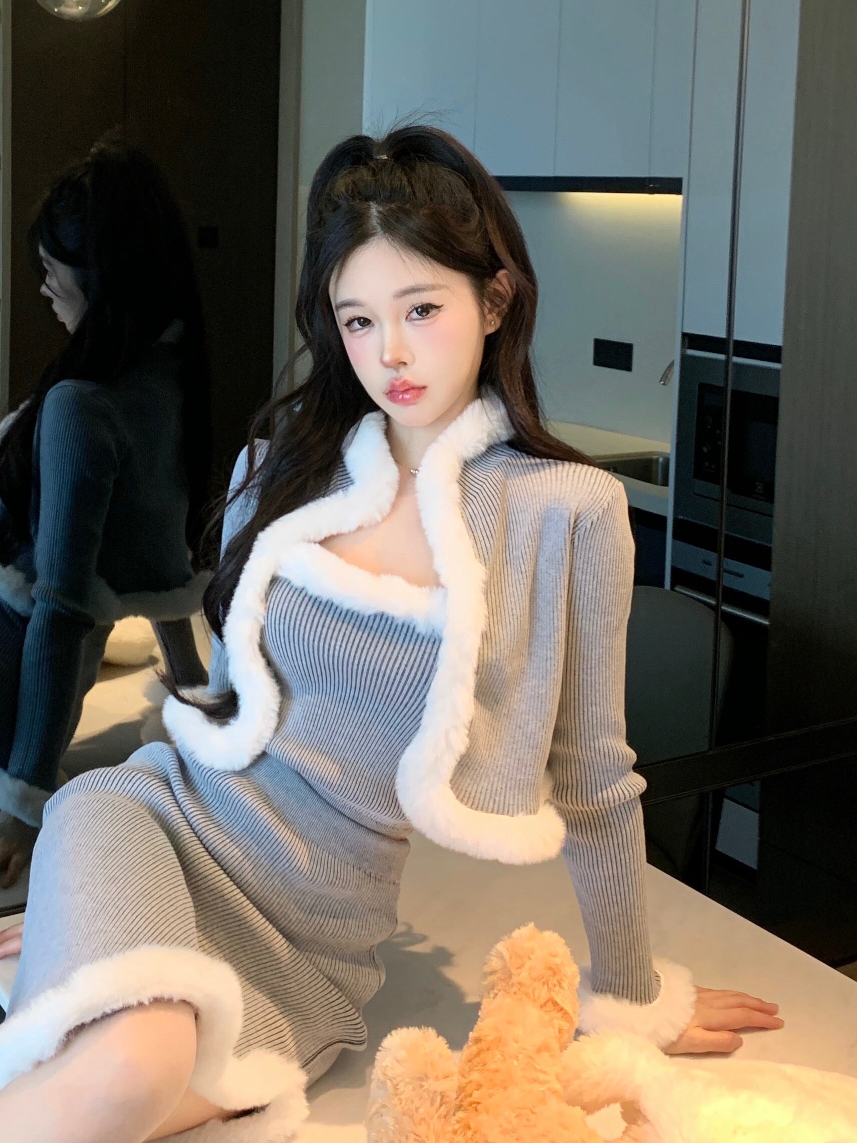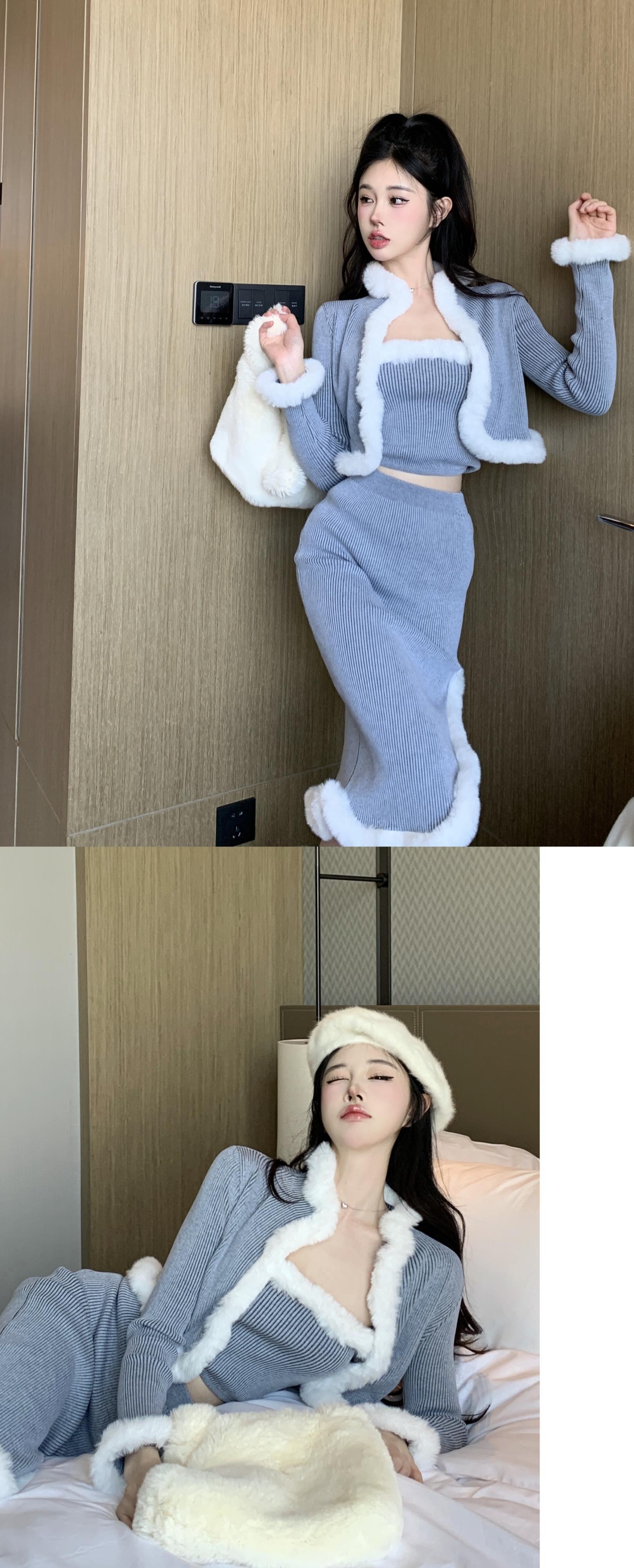 スウィートガールスーツ秋冬スタンドカラー長袖プラッシュカーディガンレディースチューブスプリットスカート3点セット ロング 大人ガーリー キュート カジュアル オータム 秋物 ウィンター 冬物