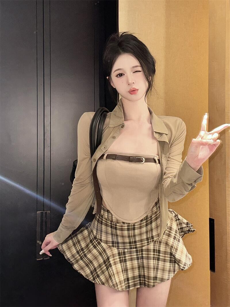 ホットガールズ春スーツのメッシュ日焼け止めカーディガンストラップレスタンクトップウエストスカート 3 点セット服 スプリング 春物