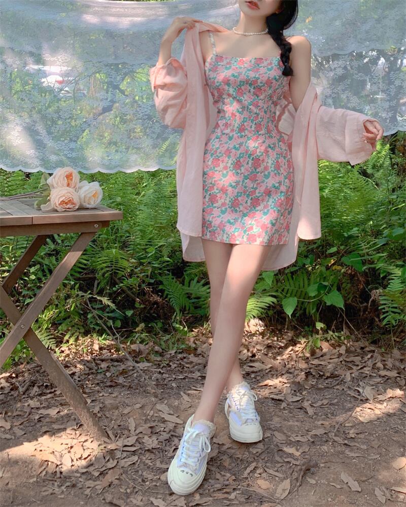 ブラウス ツーピース ドレス 年齢を減らすツーピース サマー レディース ルーズ スリム 日焼け止めシャツ + 花柄スリング ドレス 夏物