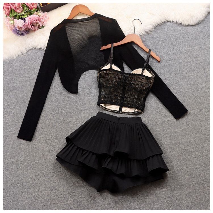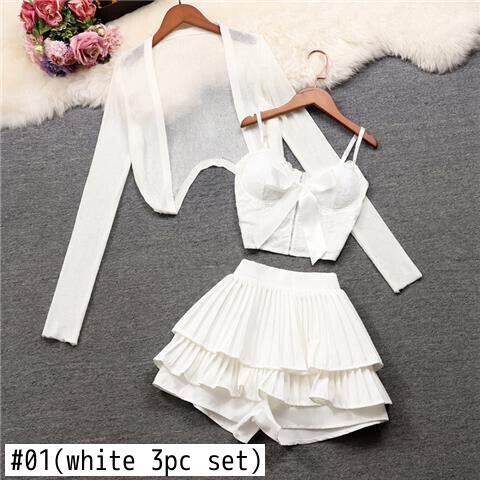 ホットガールスーツの日焼け止め長袖カーディガンコート弓ストラップレースキャミソールプリーツフリルショーツスカート 3 点セット ロング リボン ブルマー
