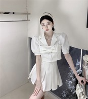 ホットで甘い女の子のスーツのの夏の弓ショート ジャケット ウエスト a ライン プリーツ スカート 2 点セット服 リボン 大人ガーリー スウィート キュート カジュアル サマー 夏物 Aライン