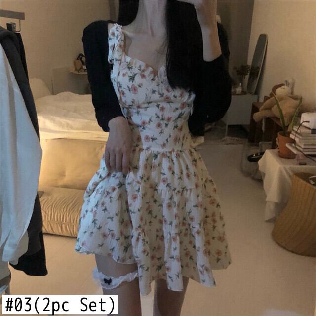 ドレスセットホットガールスタイルレースアップホルターフローラルドレス夏スリムセクシーなレイヤードショートローブ + カーディガンスーツ レッド サマー 夏物 花柄