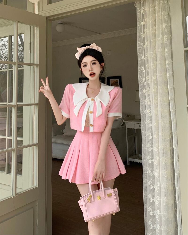 スウィートガールスーツのターンダウンカラー半袖トップウエストプリーツミニスカート 2 点セット服 大人ガーリー キュート カジュアル