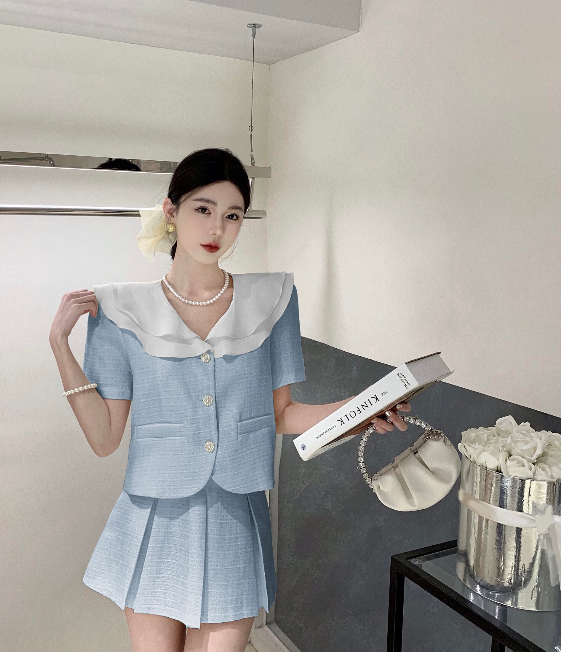 スウィートガールサマースーツレディースカラーコントラストターンダウンカラー半袖トップウエストプリーツスカート2点セット 大人ガーリー キュート カジュアル 夏物