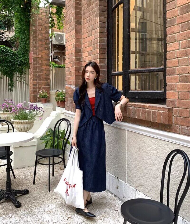 スタイル デニム スーツの夏のノッチ ショート トップ ウエスト スカート 2 点セット服 サマー 夏物