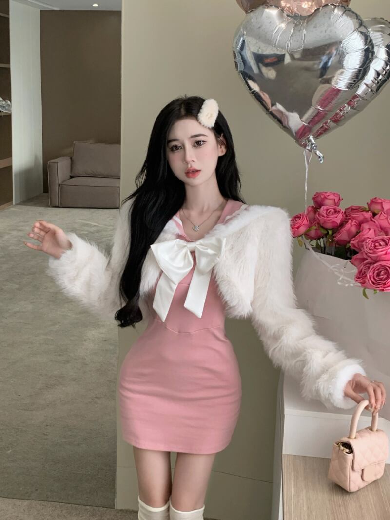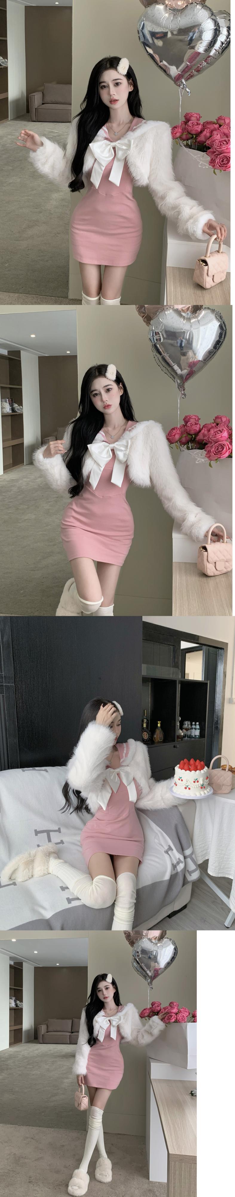甘いスタイルのスーツのの半袖レースアップウールコート弓ノットヒップラップドレス 2 点セット服 ショート リボン ハーフスリーブ 大人ガーリー スウィート キュート カジュアル
