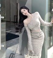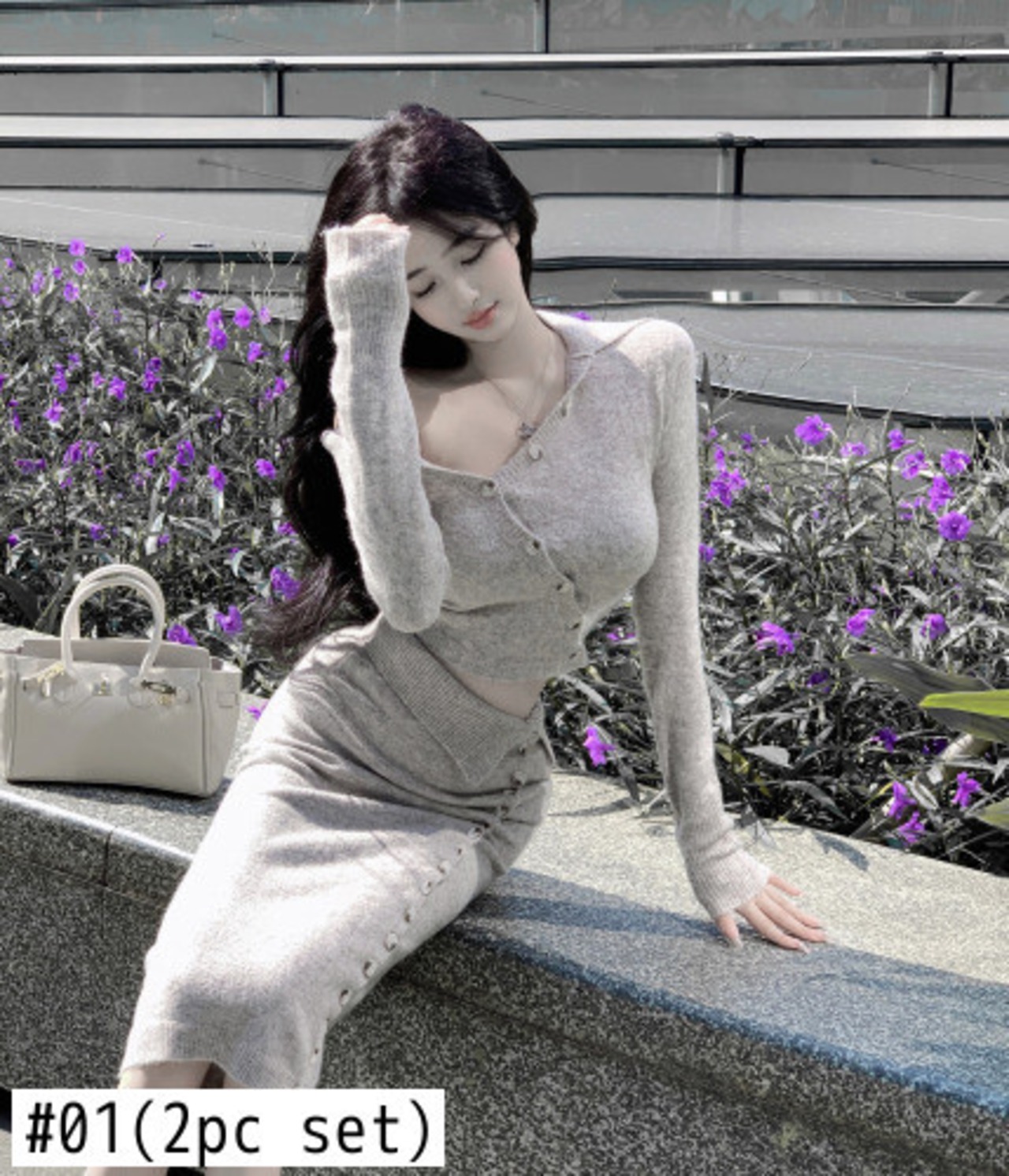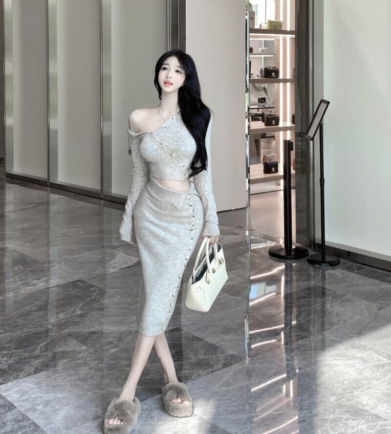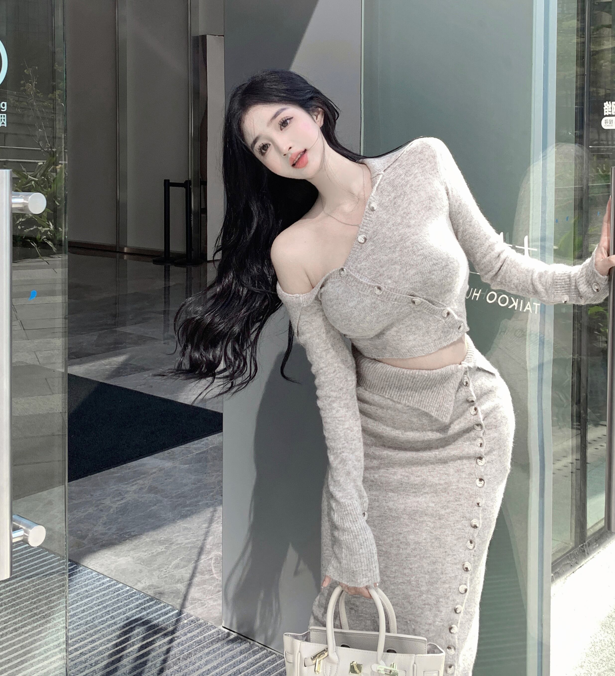 ホットガールスーツオフショルダーターンダウンカラーセーター不規則なウエストニットロングドレスツーピースセット服