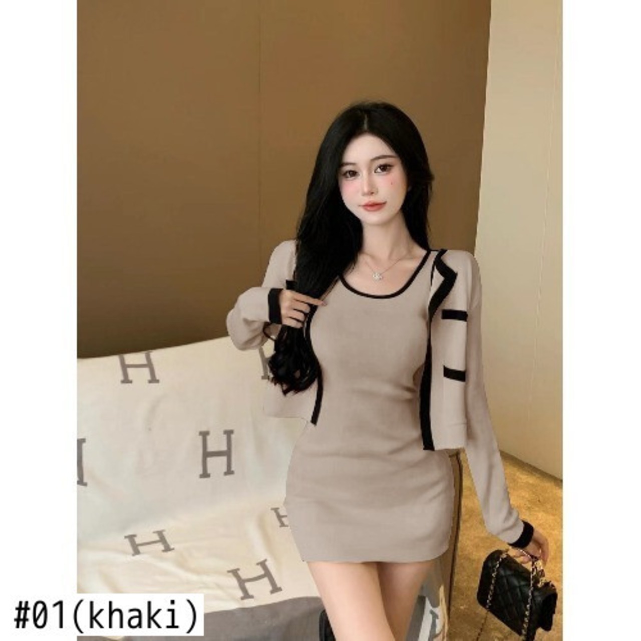 カラーコントラスト長袖ニットカーディガンコートスリムラップベストドレスツーピースセット服 ロング