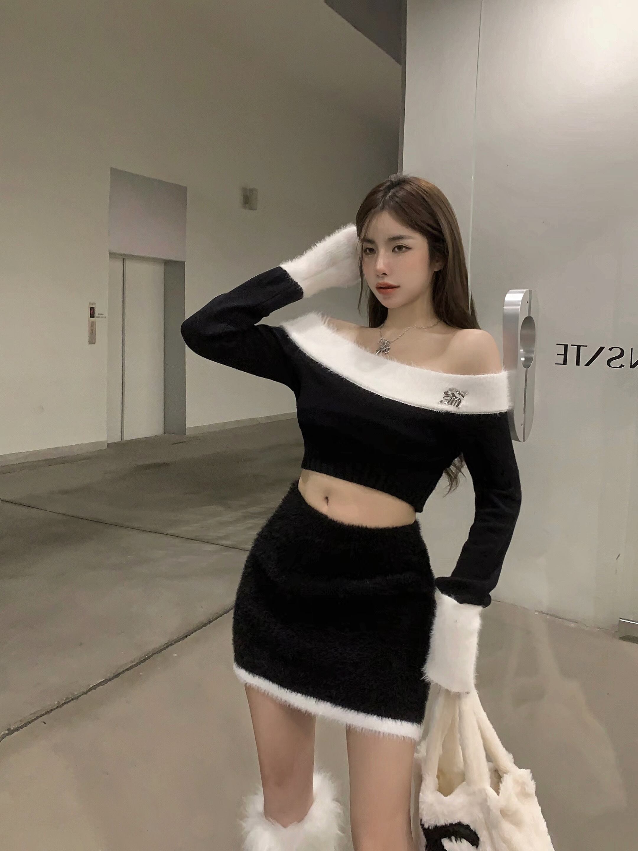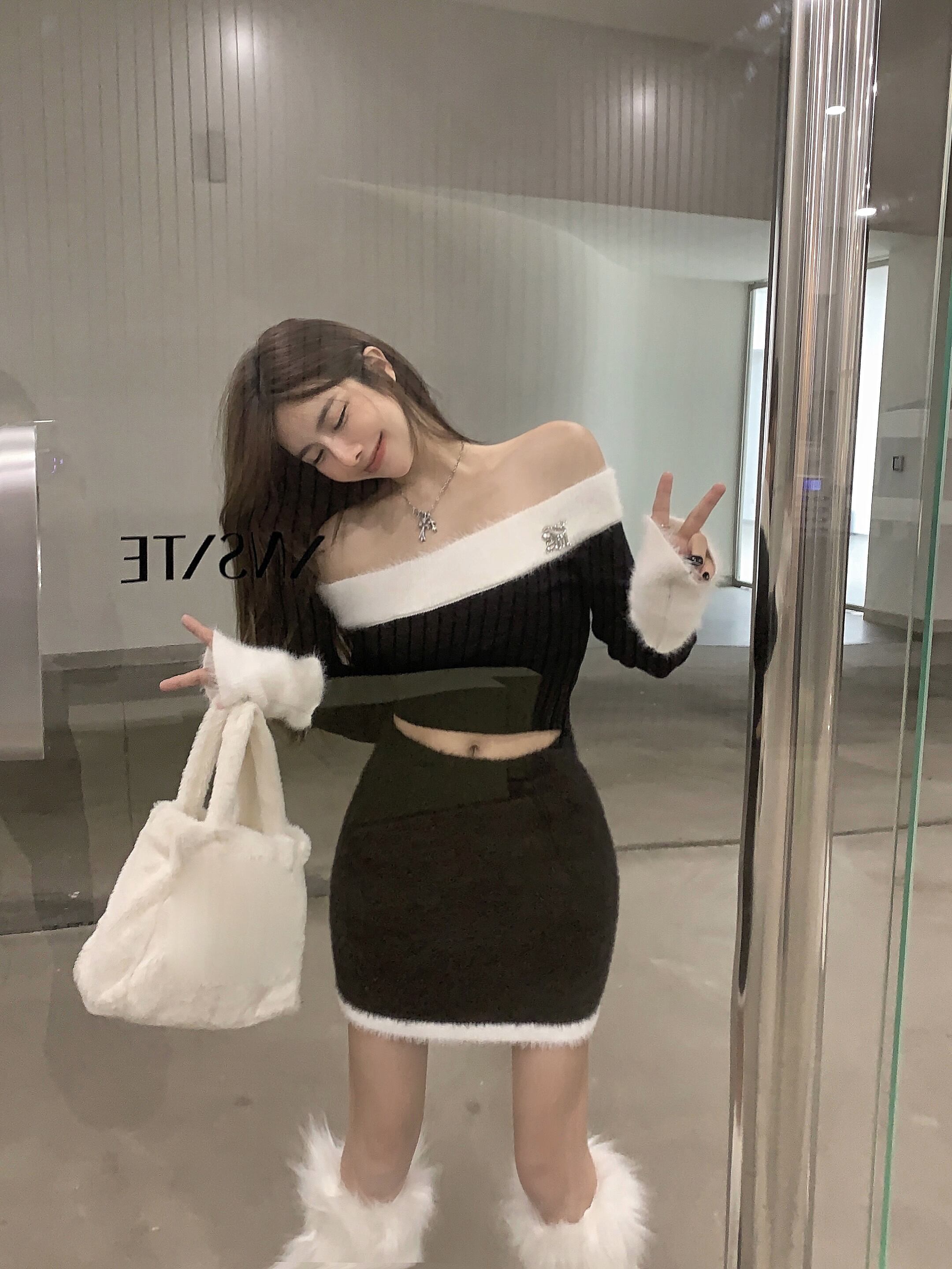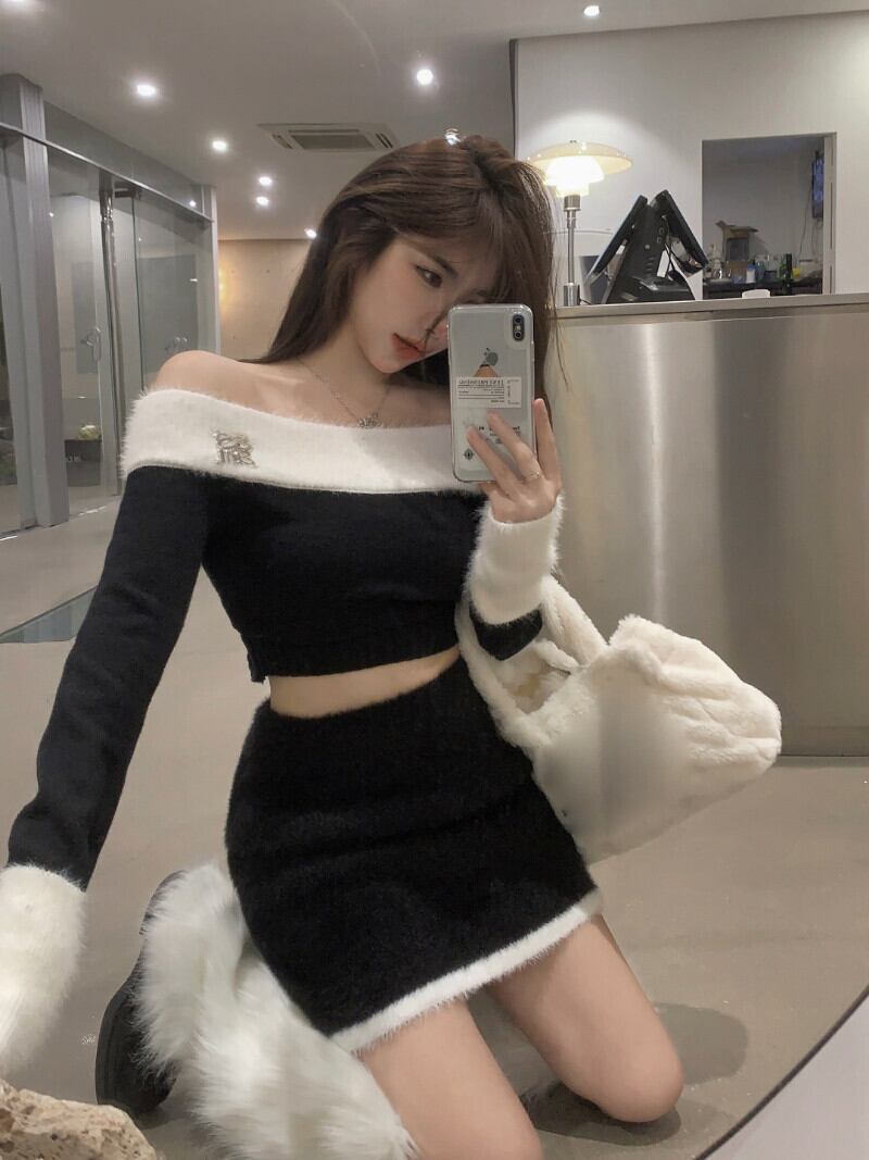 秋冬スタイルカラーブロックスラッシュネックセーターウエストニットスカートツーピース服 オータム 秋物 ウィンター 冬物