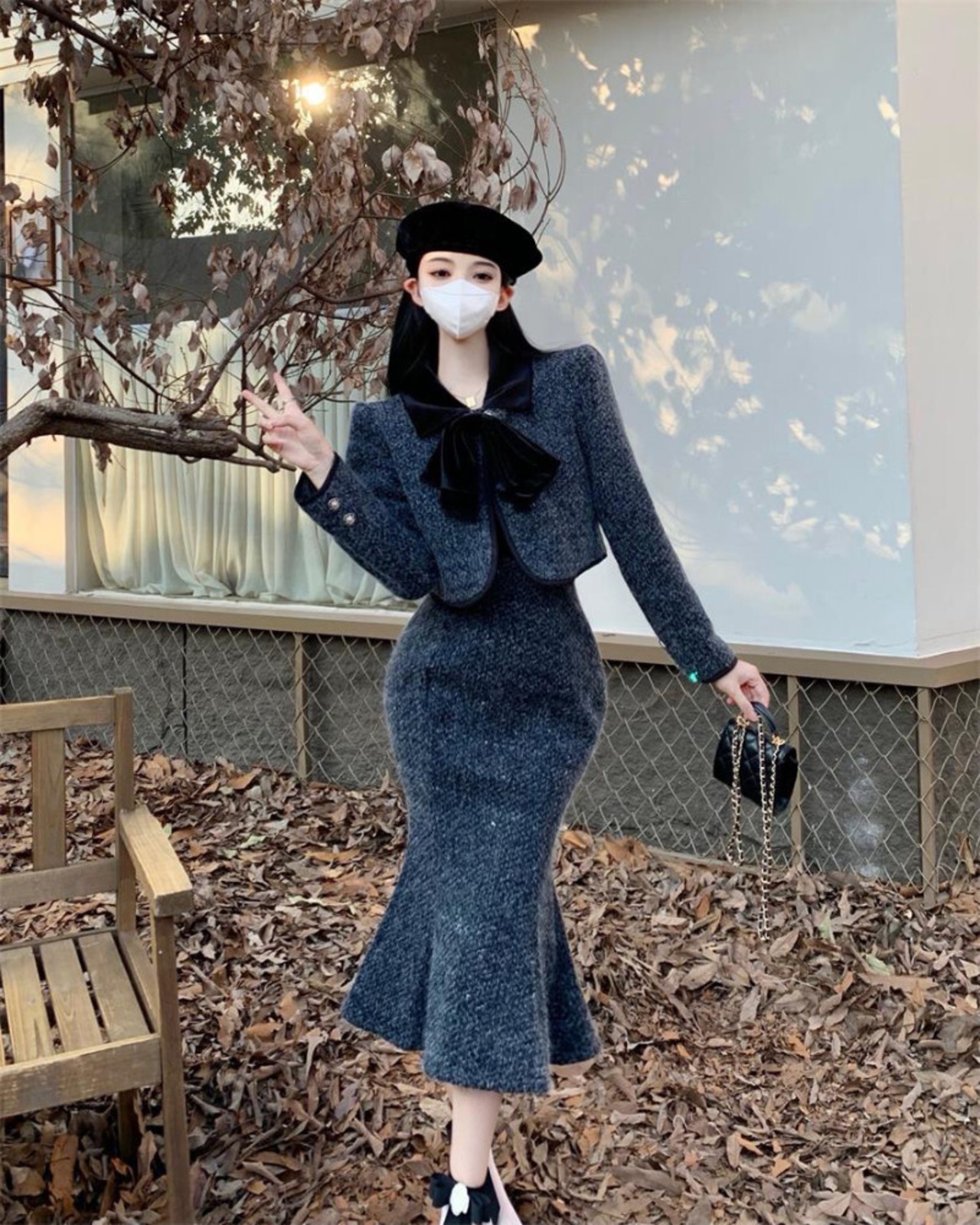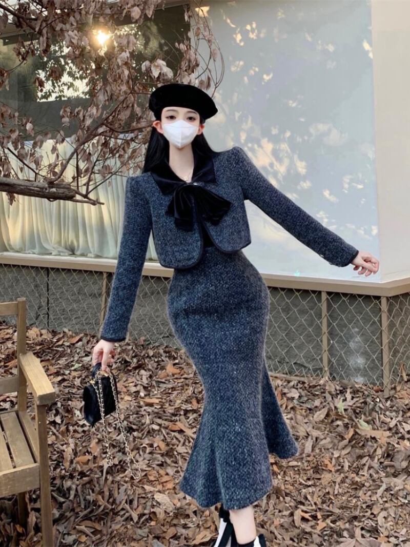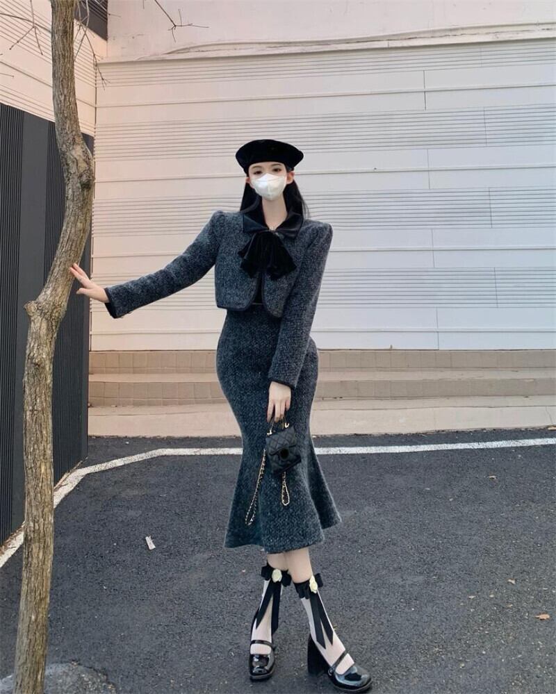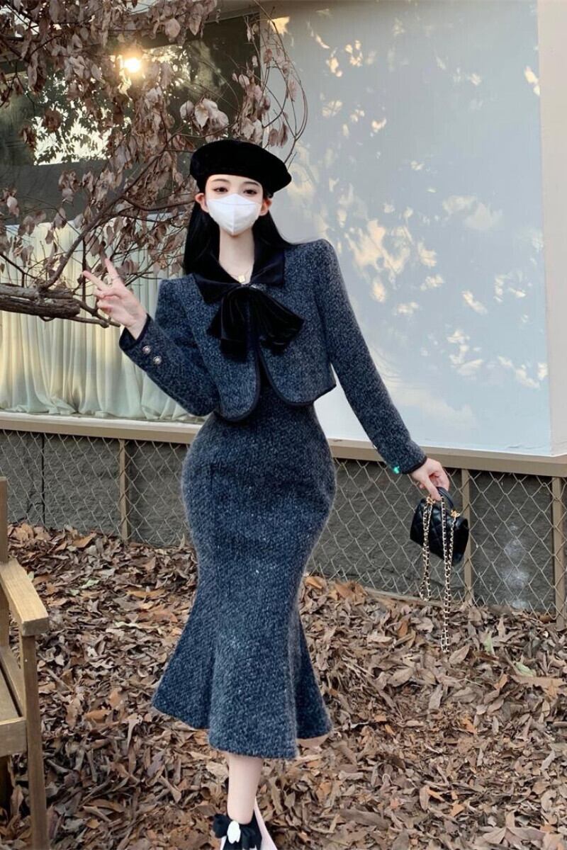 ツーピーススーツちょう結び厚手ショートコートウエストマーメイドスカートOL服 リボン 会社 学校 通勤や通学にも