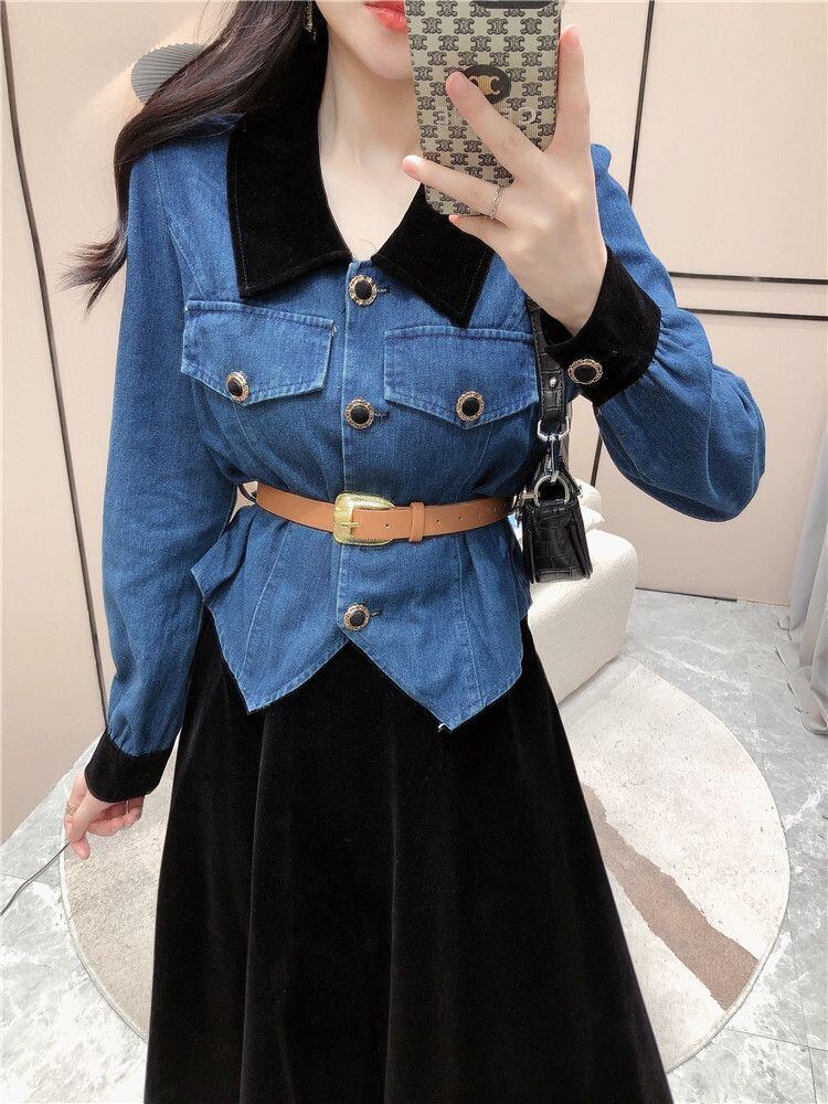 オフィスレディ レトロ通勤スーツ レディース -cl ターンダウンカラー デニムシャツ ウエストロングスカート 2点セット 洋服 会社 学校 通勤や通学にも