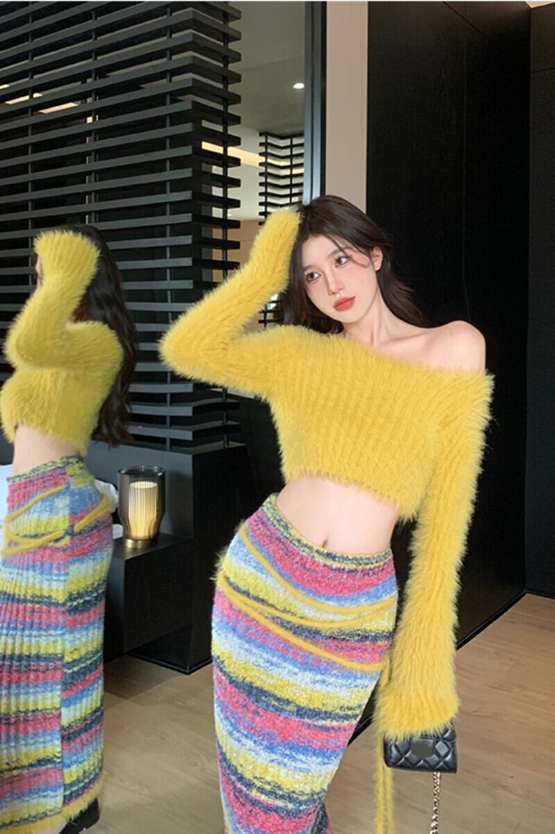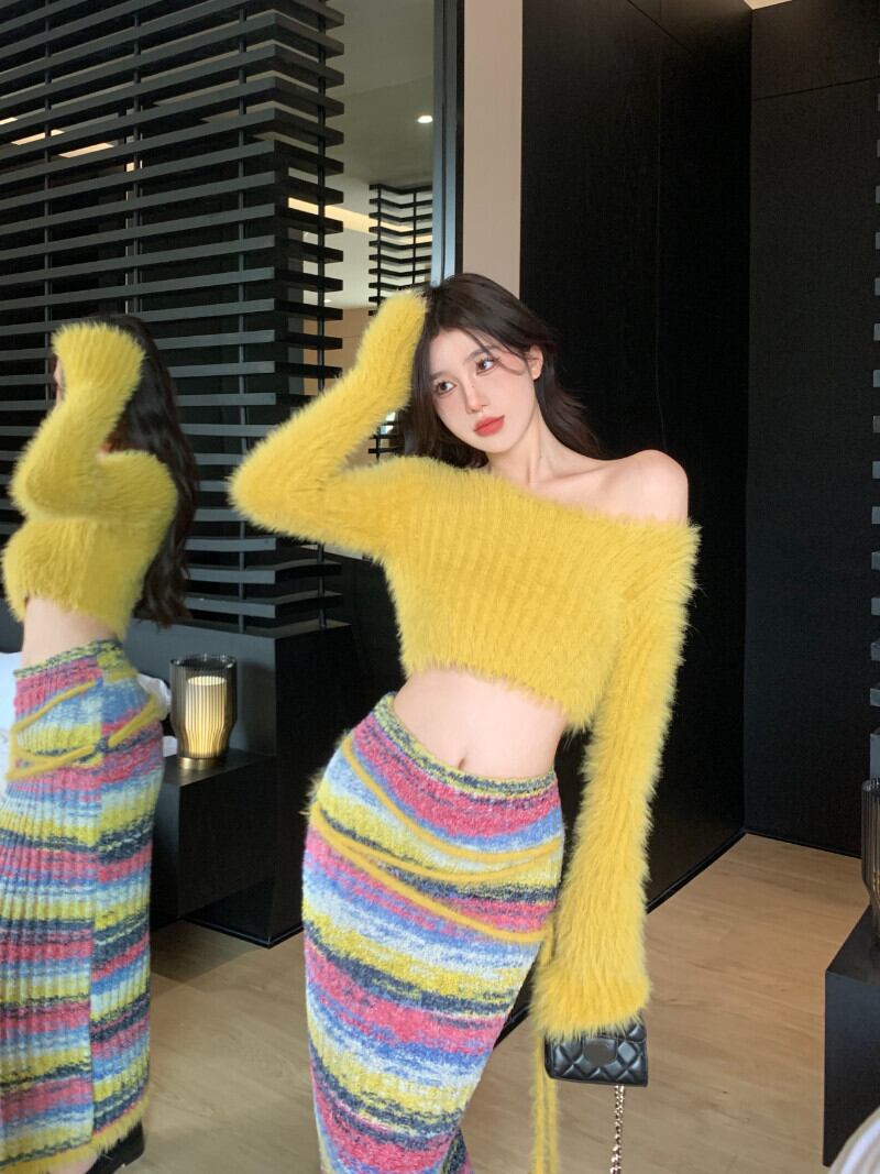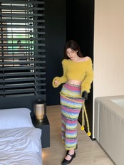 スウィートガールスーツジンジャーニットトップ豪華なセーターホットガールストライプ弾性ウエストロングスカート 2 点セット服 エラスティック 伸縮 大人ガーリー キュート カジュアル