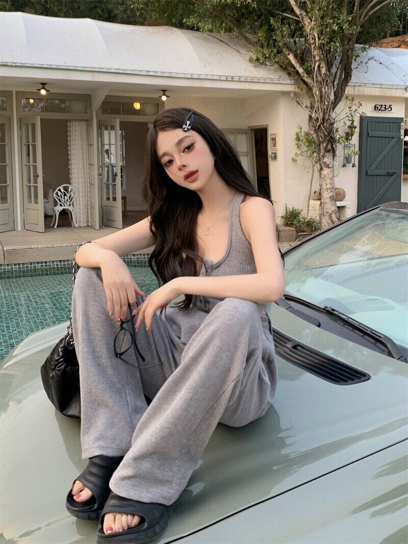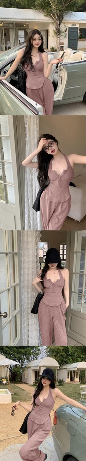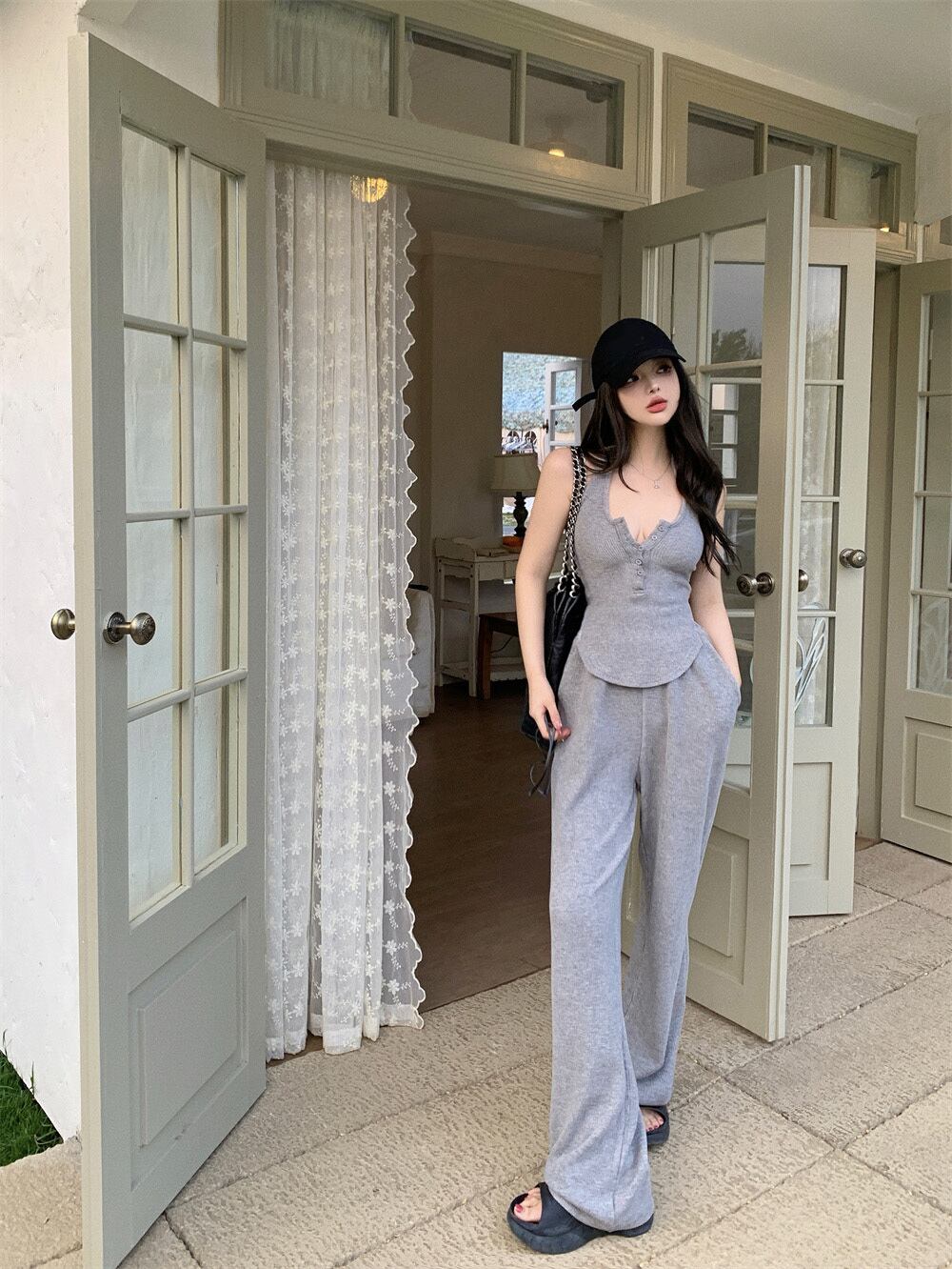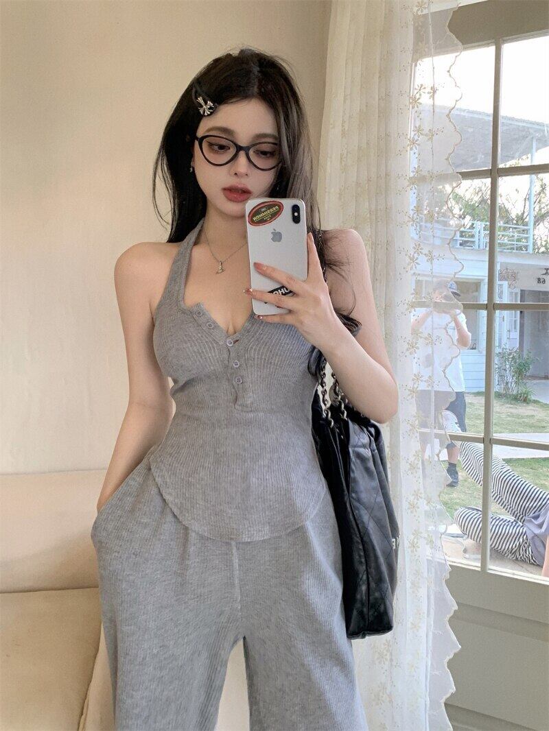 怠惰なスタイルスーツグレーホルタートップホットガールズセクシーなベストウエストルーズワイドレッグパンツツーピースセット服 ワイドパンツ
