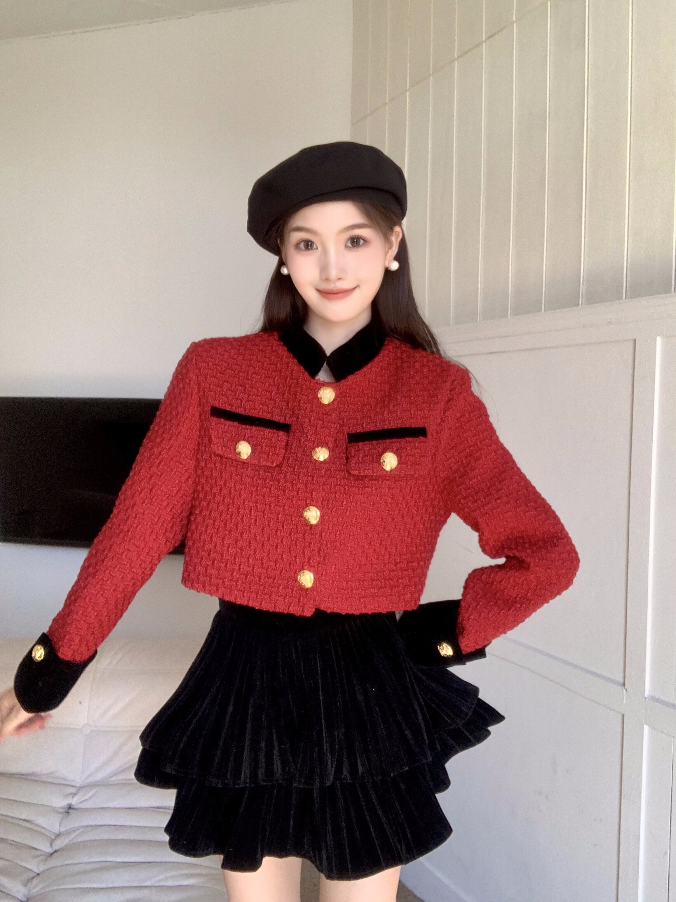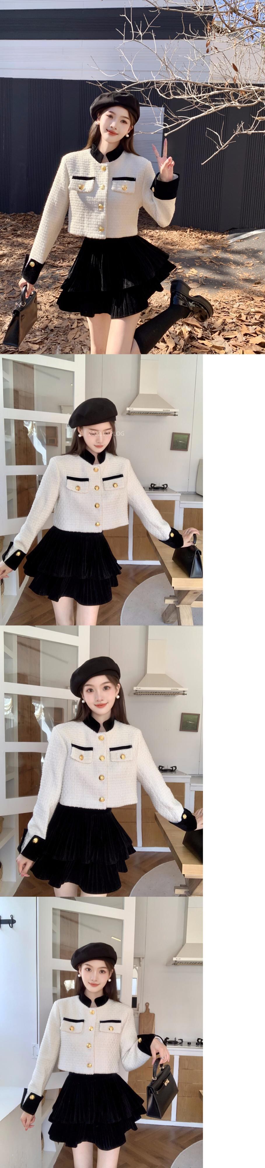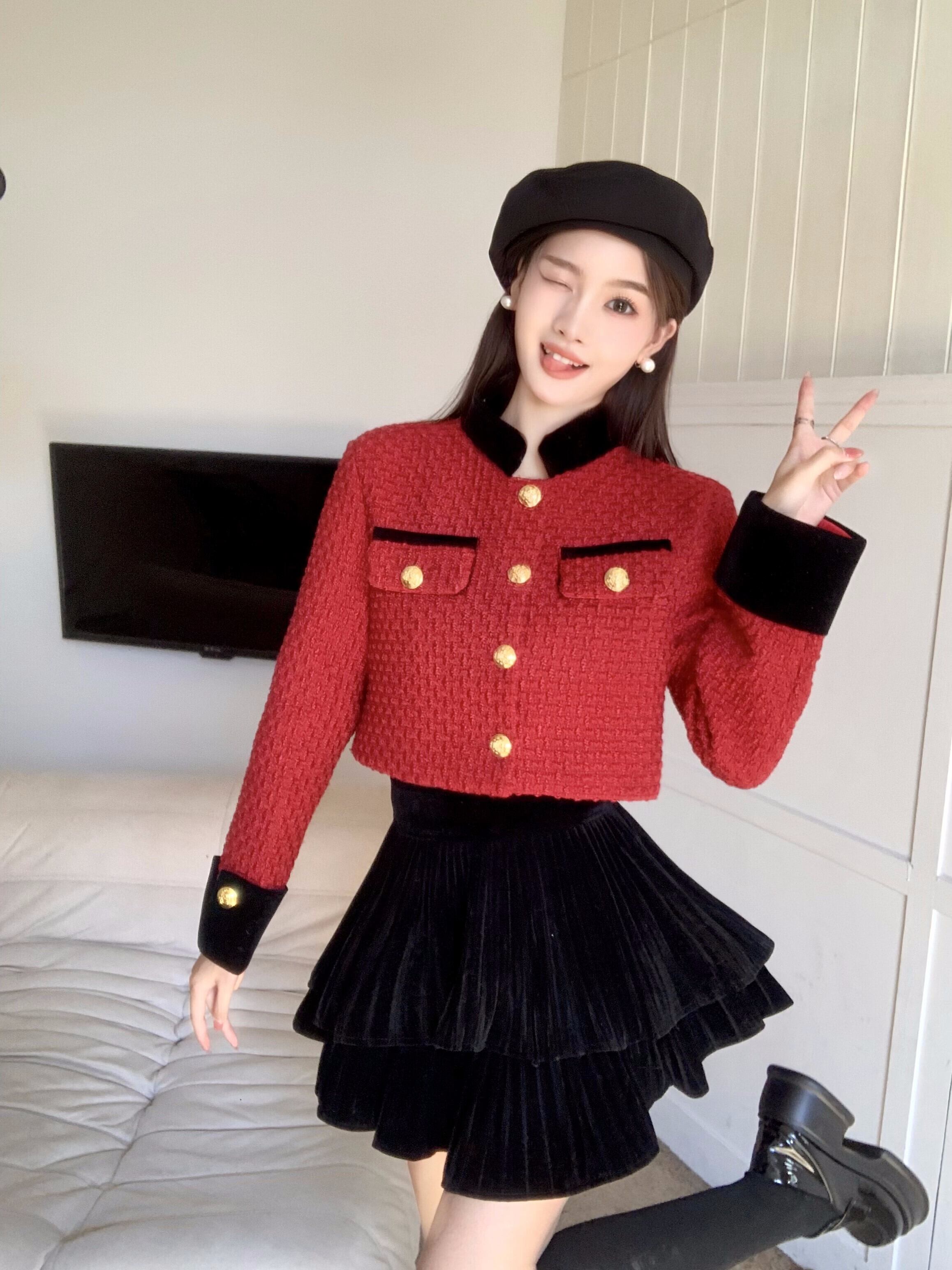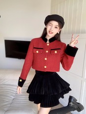 冬肥厚綿気質ツイード ショート コートシックなベルベット二重層プリーツ ケーキ スカート 2 点セット コットン ウィンター 冬物
