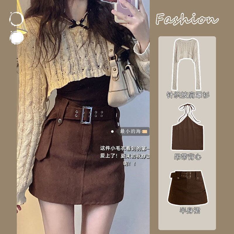 Gothiscyn 3 点セットレディース衣装中空ニットショールブラウスミニスカート無地梨花服秋スカートセット オータム 秋物 ソリッドカラー