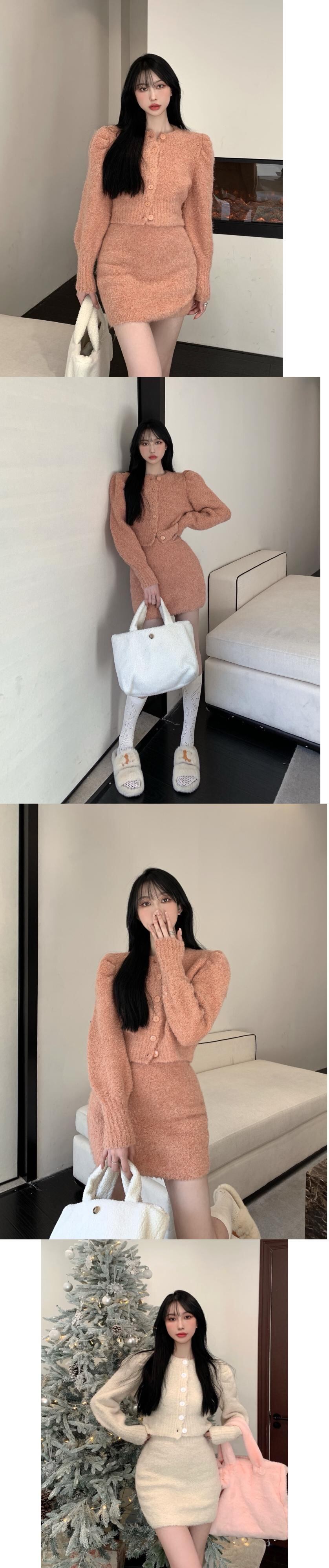 ホットガールスーツパフスリーブニットカーディガンコート秋冬スタイルセータートップショートフリーススカート 2 点セット オータム 秋物 ウィンター 冬物