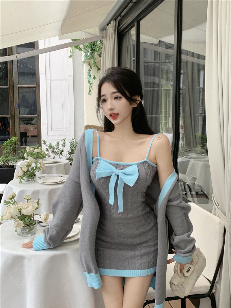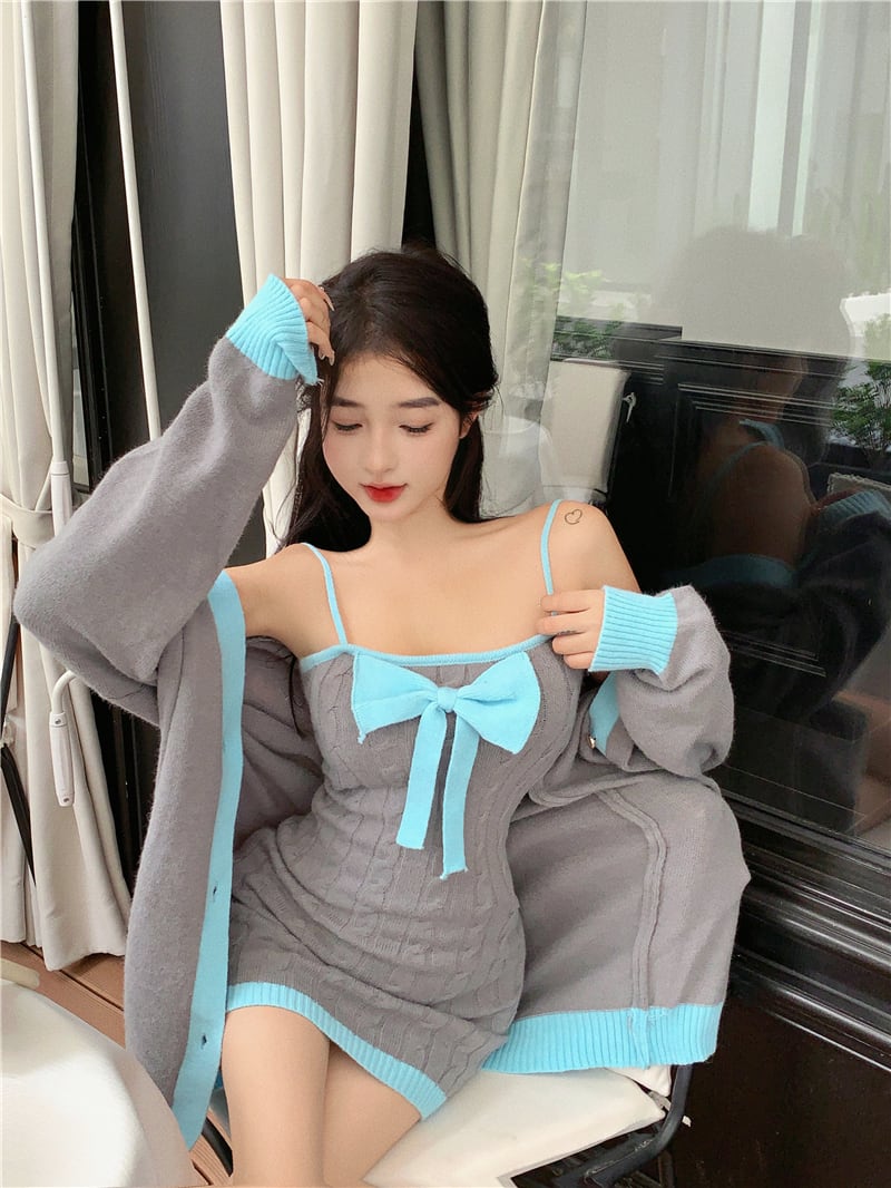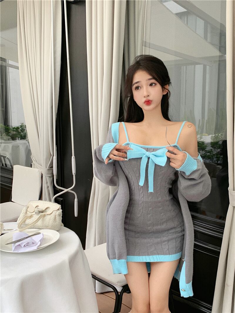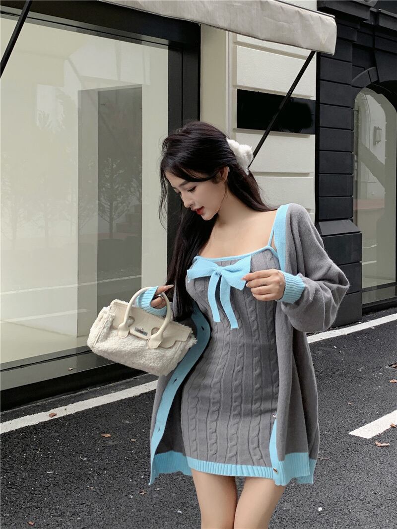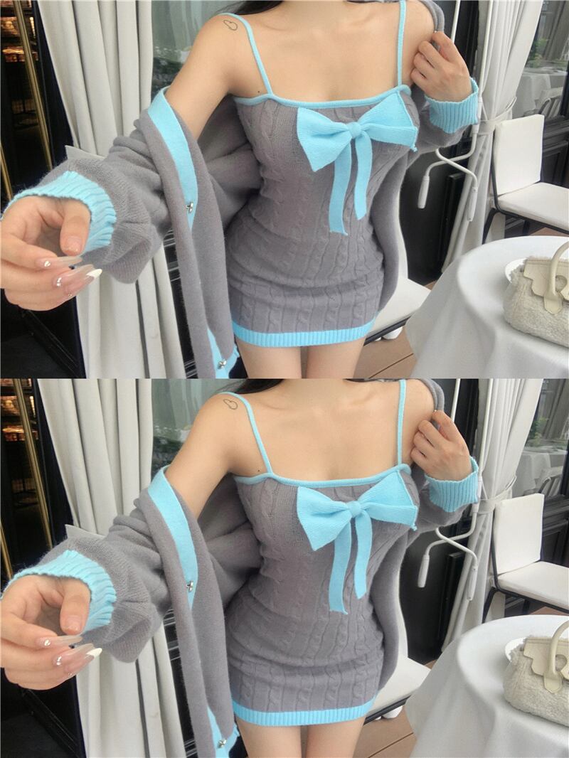 スウィートガールニットスーツ弓ニットサスペンダードレス長袖カーディガンコートツーピースセット服 ロング リボン 大人ガーリー キュート カジュアル