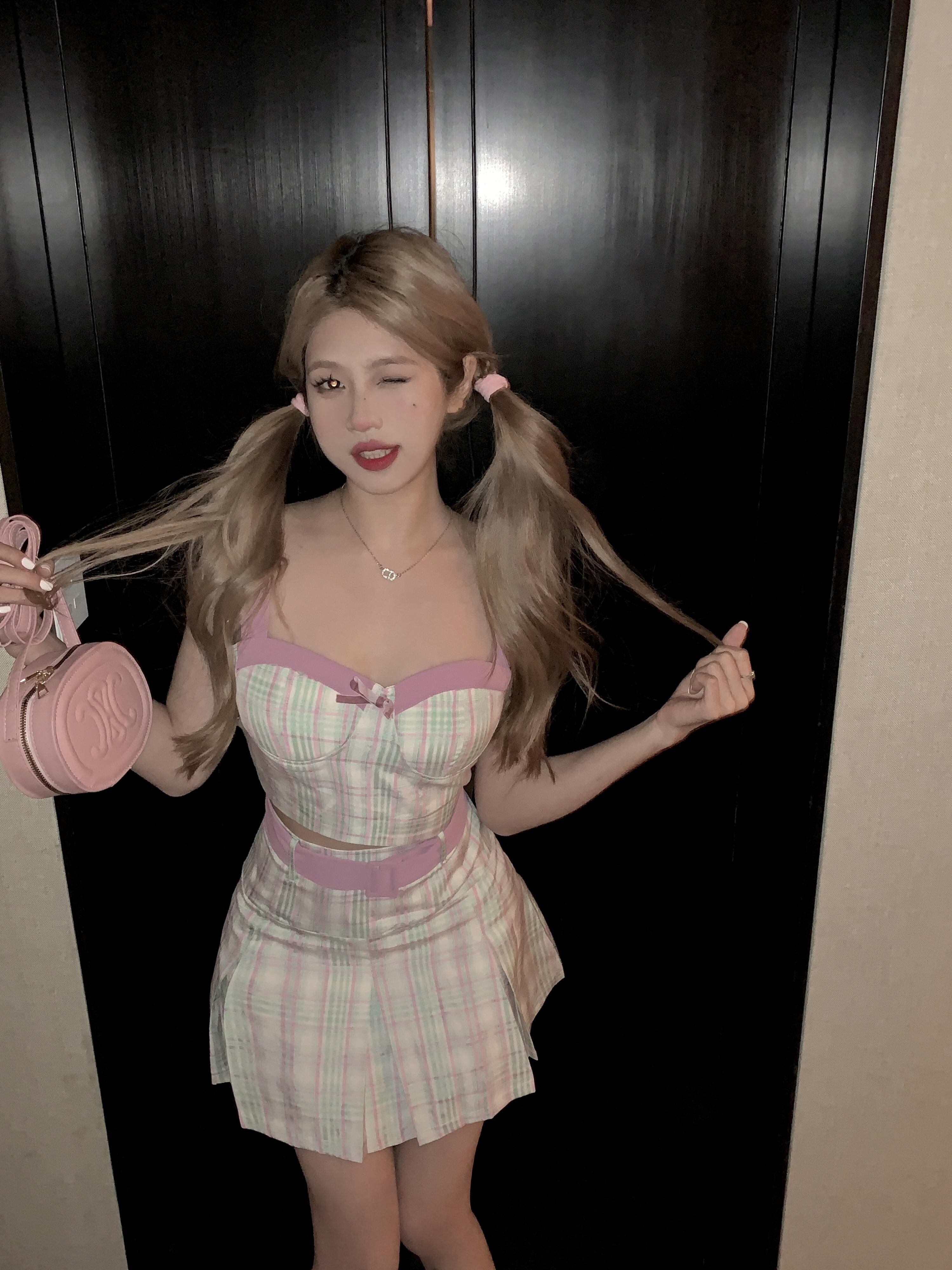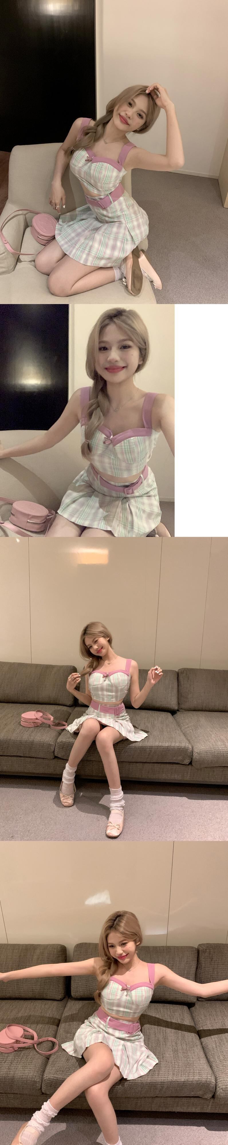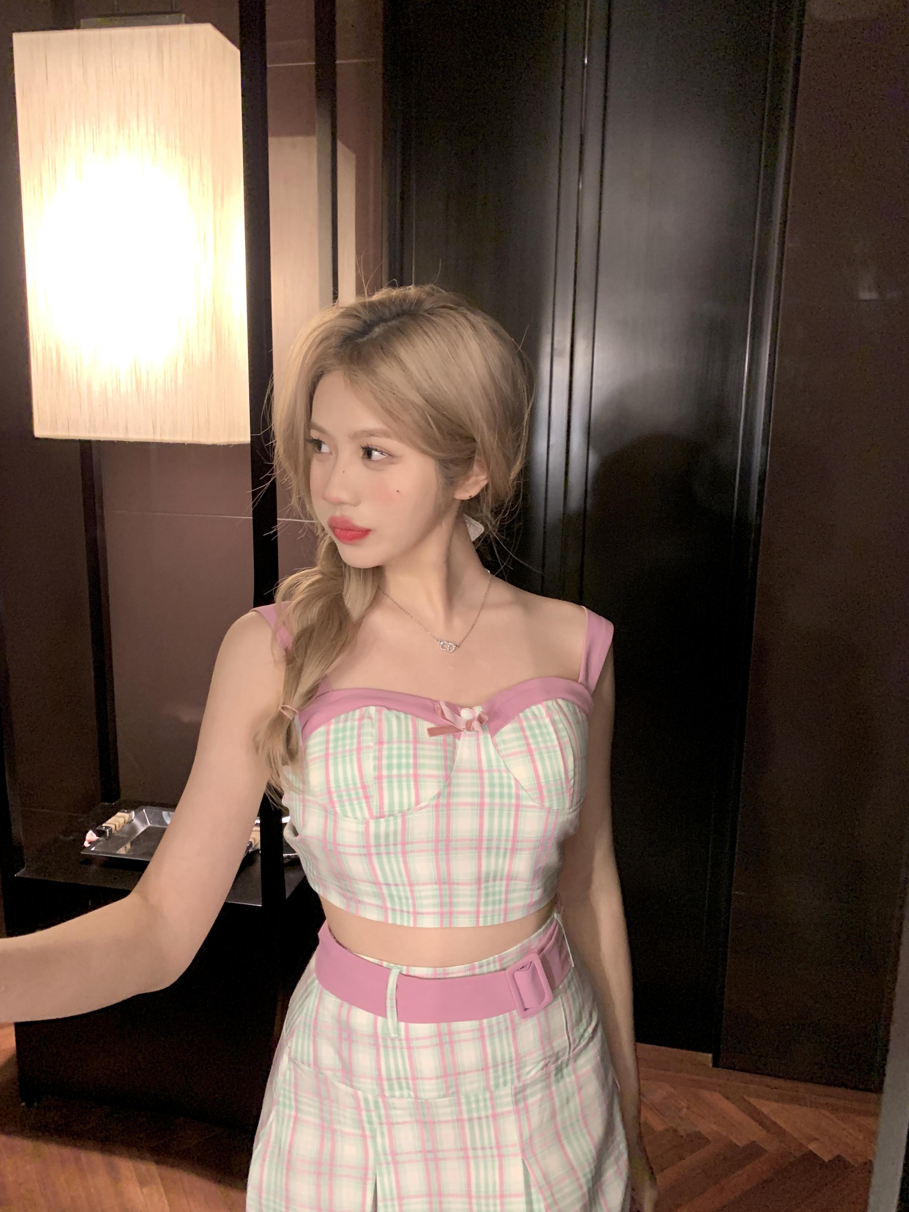 甘いホット女子セクシーなスーツ夏格子縞ストラップタンクトップウエスト A ラインプリーツスカート 2 点セット服 大人ガーリー スウィート キュート カジュアル サマー 夏物 Aライン