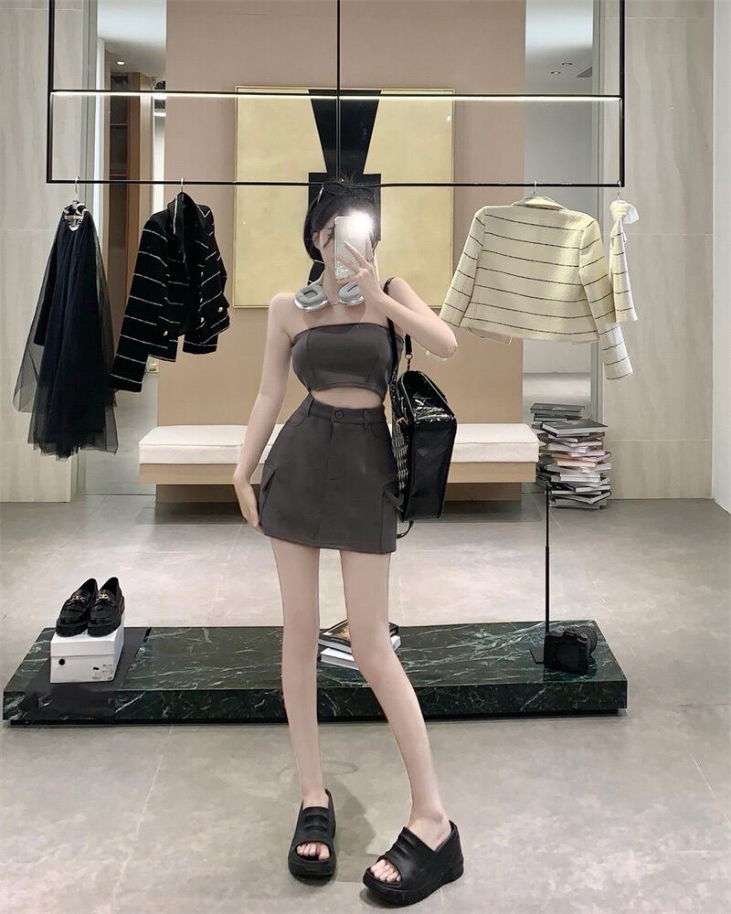 ホットガールサマースーツストラップレスベストウエストスリムフィットラップヒップミニスカートツーピースセット服 夏物