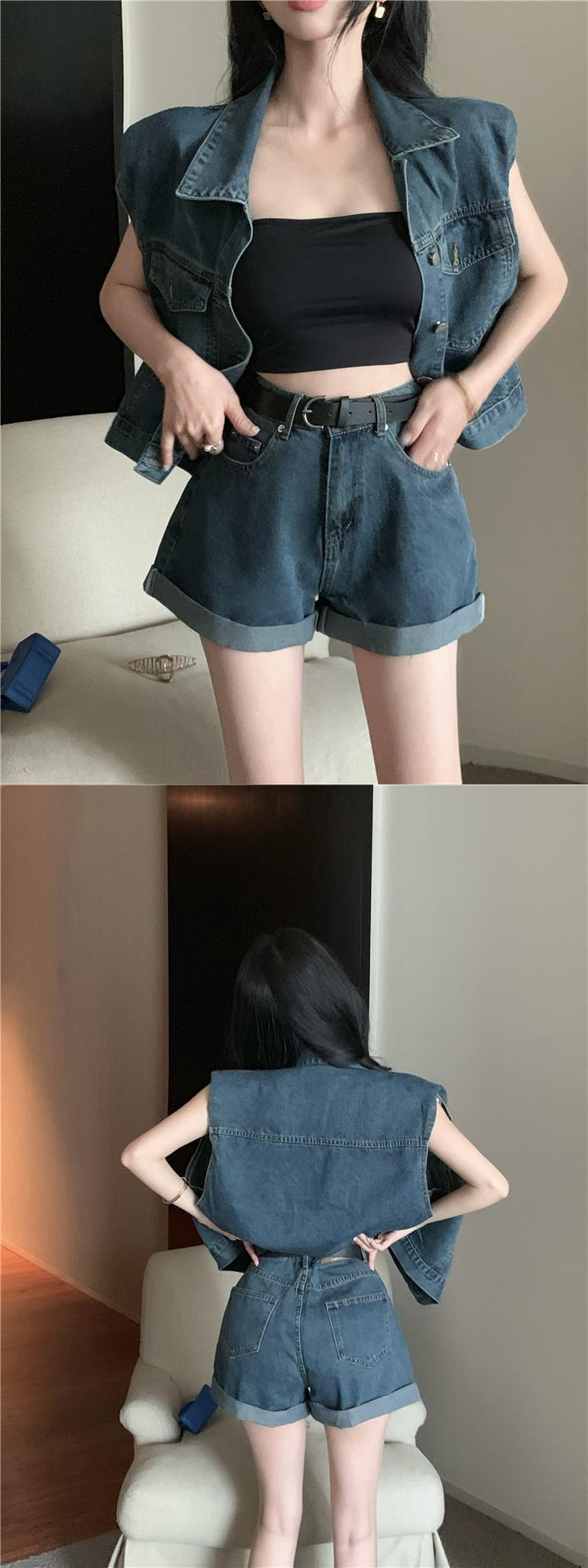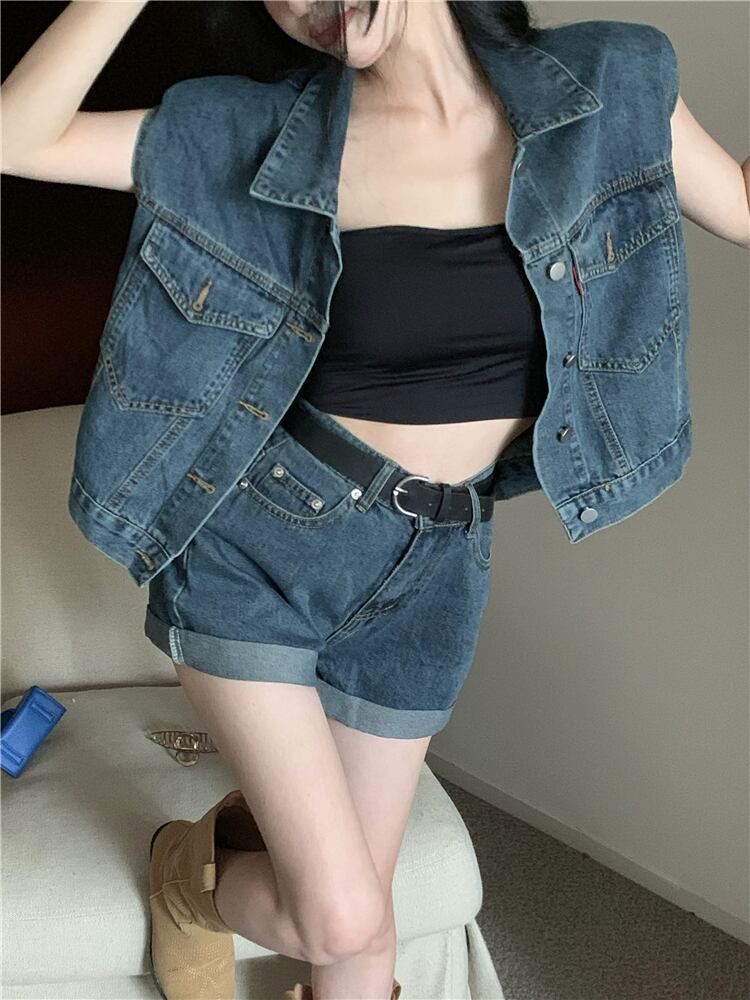 スイートクールスーツレディースターンダウンカラーノースリーブベストウエスト万能デニムショーツ2点セット服 大人ガーリー スウィート キュート カジュアル ブルマー