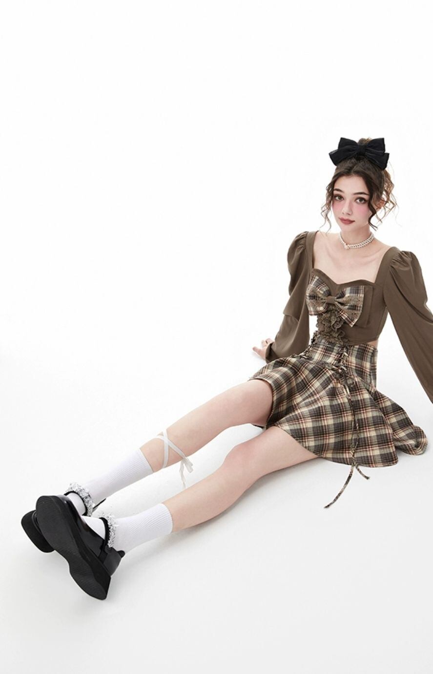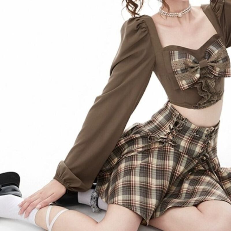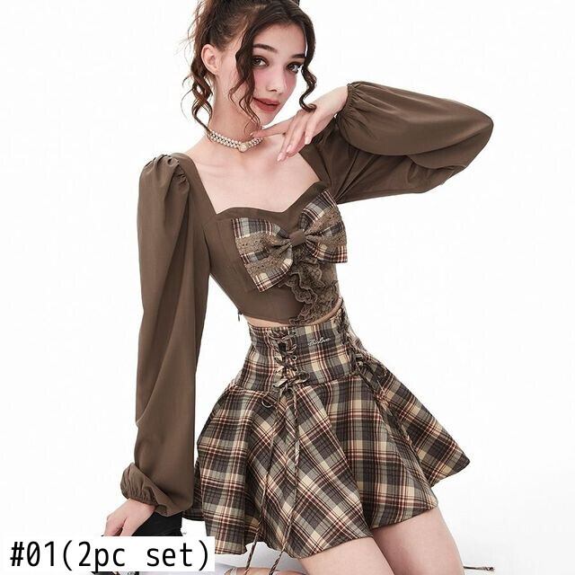 スウィートガールスーツスクエアカラーチェック柄ボウレースシフォンシャツウエスト A ラインスカート 2 点セット服 リボン 大人ガーリー キュート カジュアル Aライン スクウェア