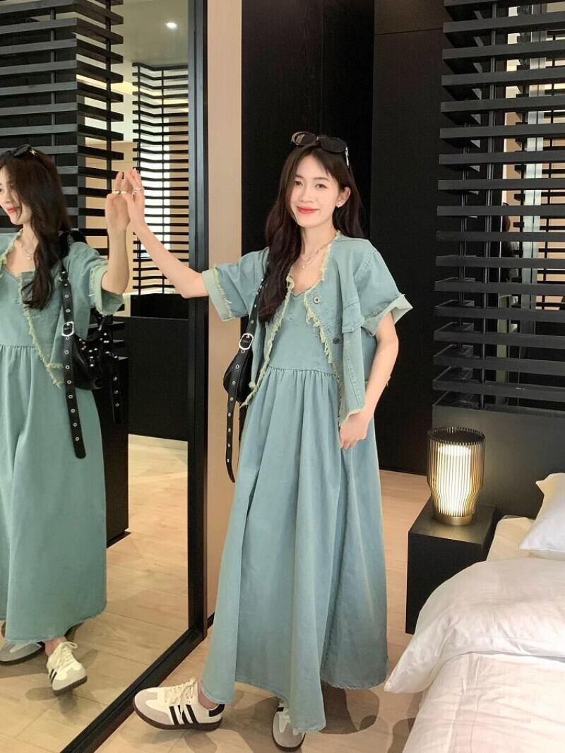 ホットガールスーツ夏電話半袖デニムシャツストラップドレス 2 点セット服 サマー 夏物