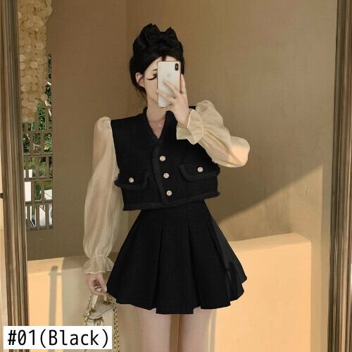 スウィートガールスーツフレンチ V ネックメッシュスリーブトップウエストプリーツ A ラインスカート 2 点セット服 大人ガーリー キュート カジュアル Vネック Aライン