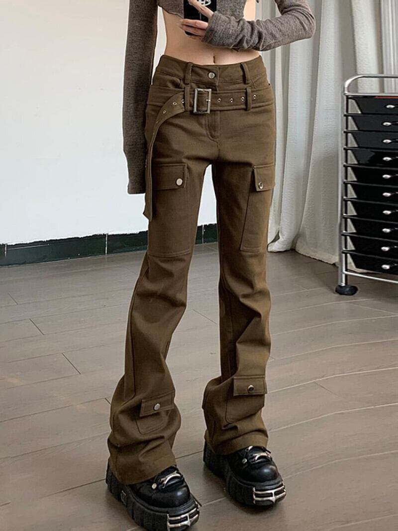 アメリカンストリートバイブコーヒーカラーカーゴジーンズレディース春夏ベルトストレートパンツ服 スプリング 春物 サマー 夏物 ハーネス