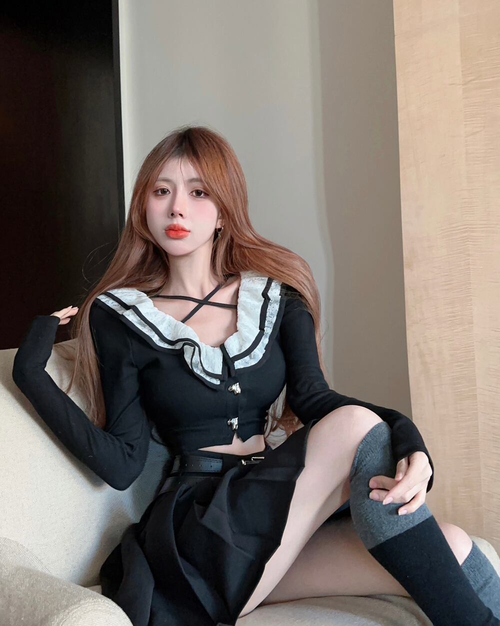 スパイス ガール Y2k スーツ クロス コントラスト フリル ショート ロング スリーブ トップ ウエスト ダブル ベルト プリーツ スカート 2点セット 長袖 ハーネス