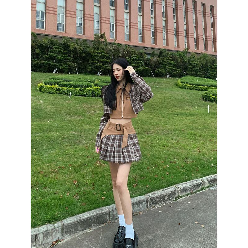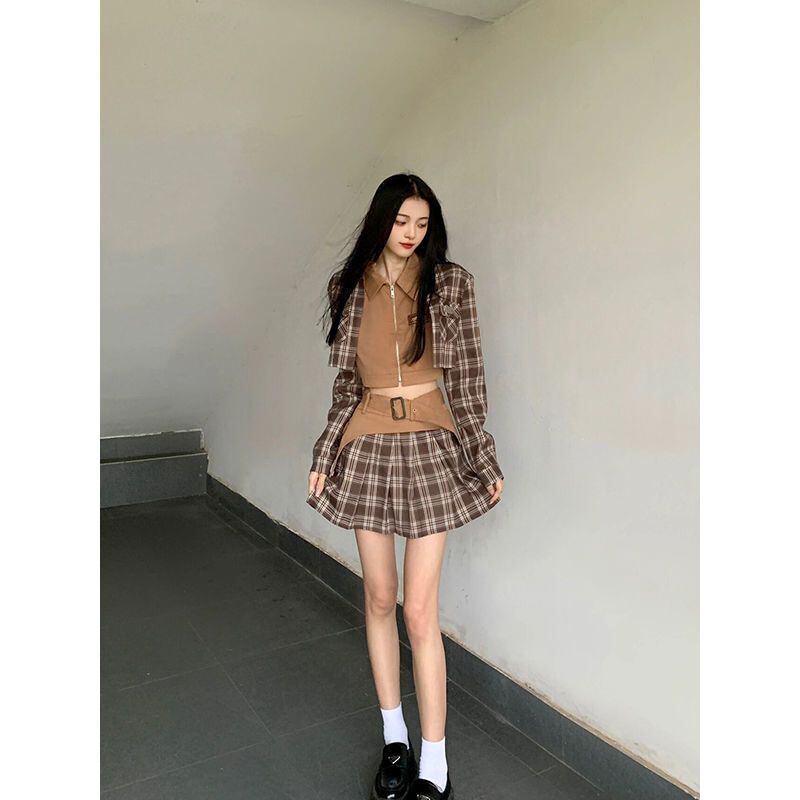 ホットガールチェック柄カラーコンビネーションスーツ春長袖コートポロ襟ジッパータンクトップショートスカートスリーピースセット ロング スプリング 春物