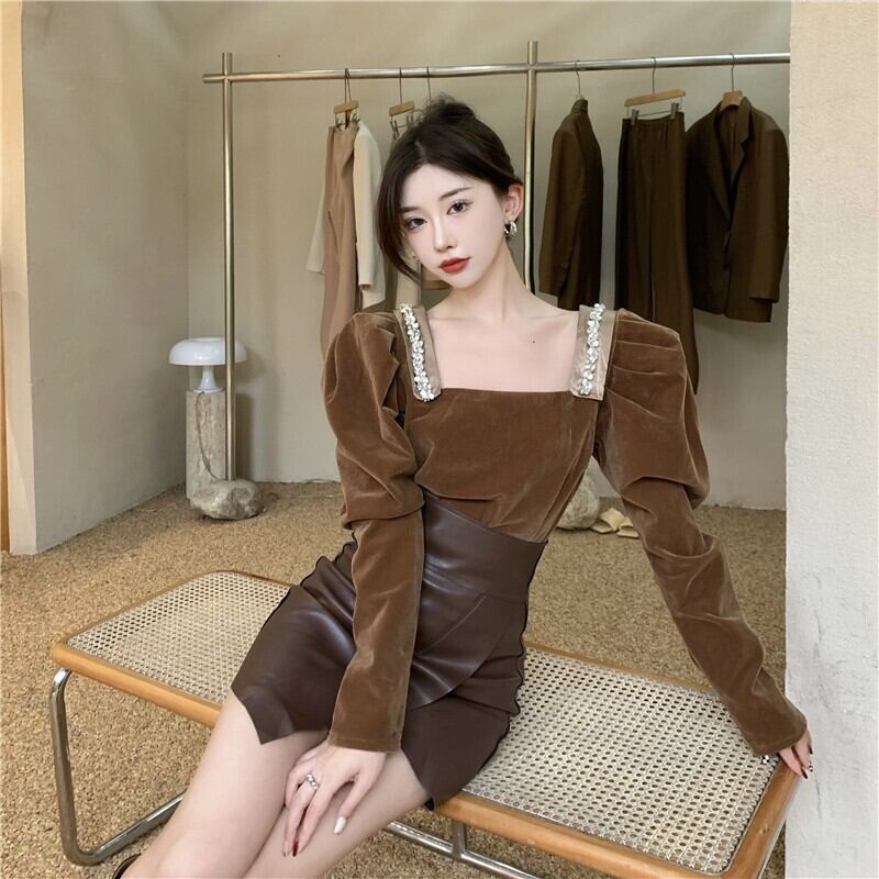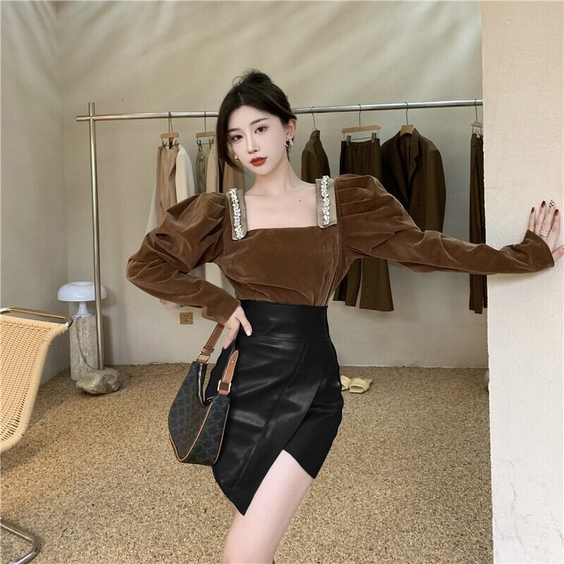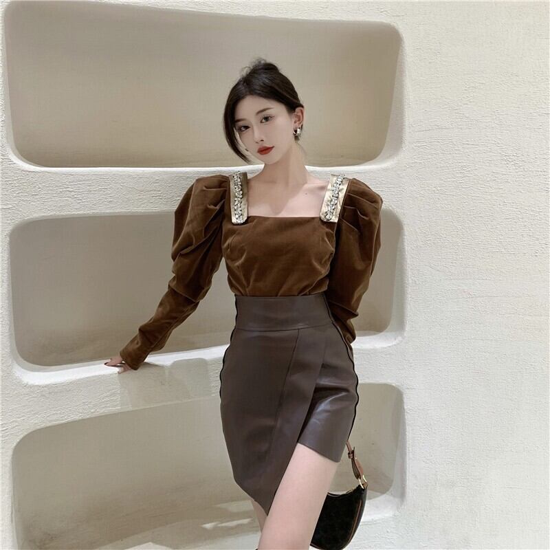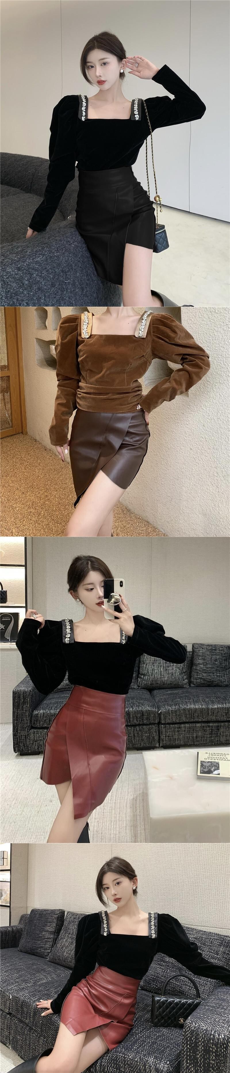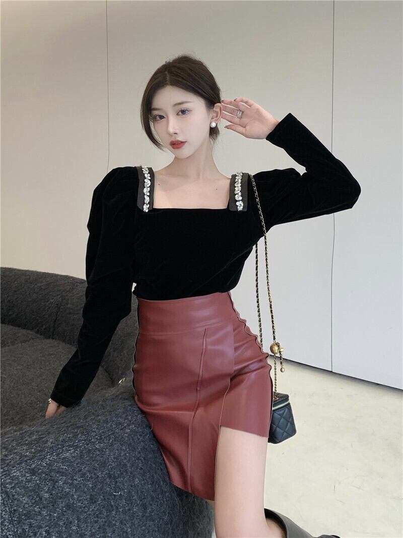 セレブスタイル スーツ ベルベット ラインストーン 底入れシャツ t PU イレギュラー スカート ツーピース セット服