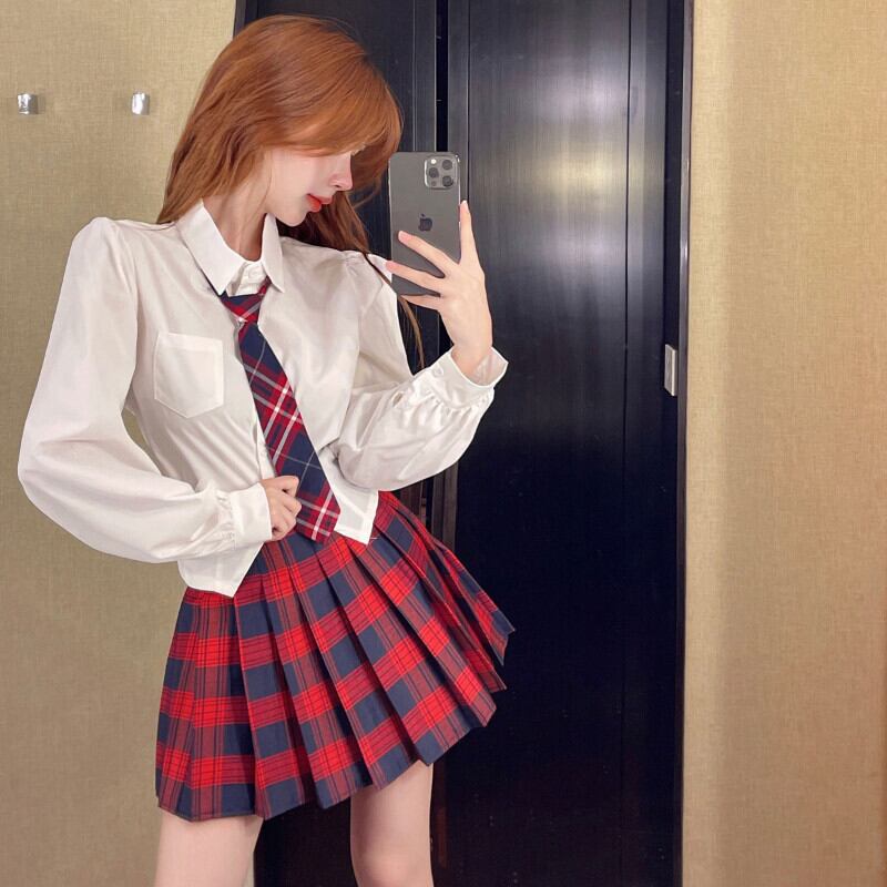 スタイルスーツ長袖シック万能ウエストシャツ JK 柄チェック柄プリーツスカート 2 点セット服 ロング
