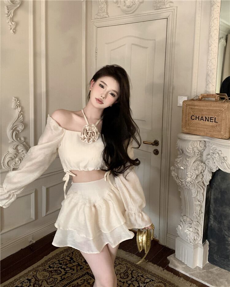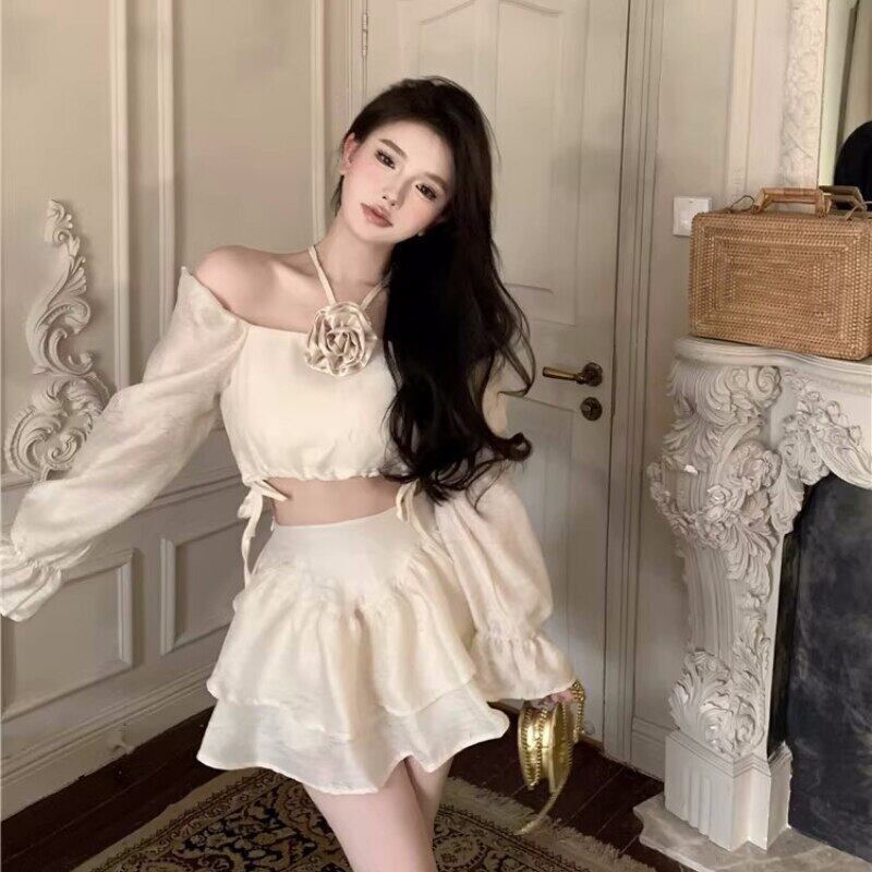 甘いホットガールズサマースーツホルターショート長袖シャツウエストミニスカートツーピースセット服 ロング 大人ガーリー スウィート キュート カジュアル 夏物