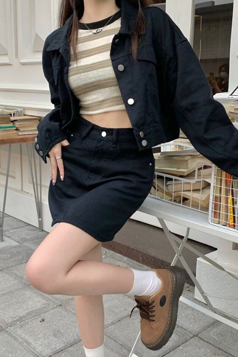 ホットガールズデニムスーツ春黒コートウエストラップヒップショートスカートツーピースセット服 ブラック スプリング 春物