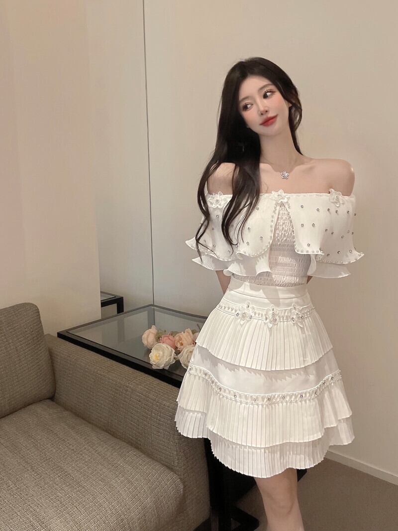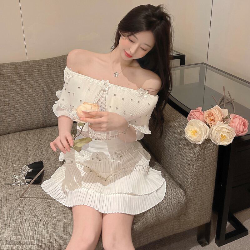 夏甘い女子スーツグレード フリル シャツ ウエスト A ライン スカート 2 点セット服 大人ガーリー スウィート キュート カジュアル サマー 夏物 Aライン