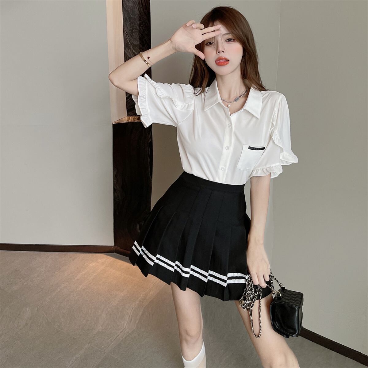 Gothiscyn ホットガールツーピーススーツ夏 JK 甘いプレッピー花びらスリーブシャツトッププリーツショートスカート 大人ガーリー スウィート キュート カジュアル サマー 夏物