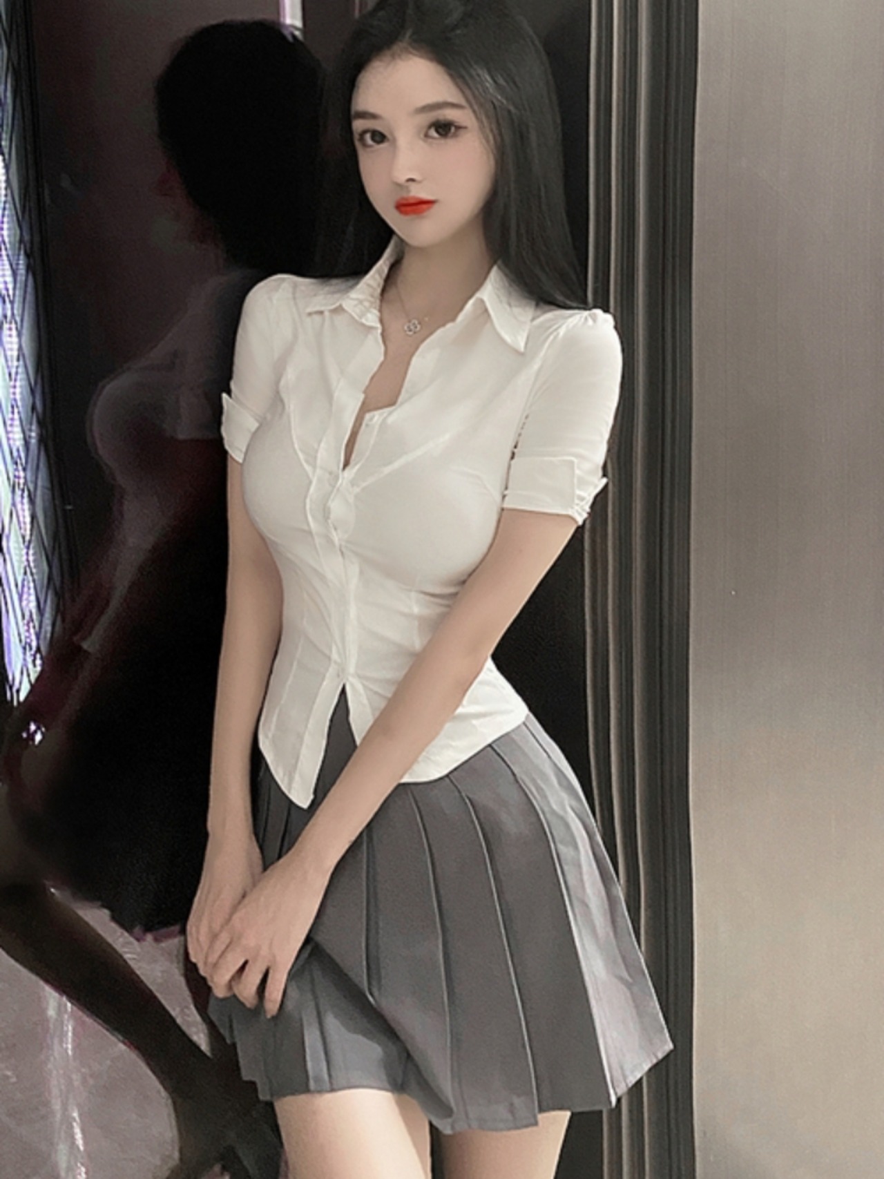 サマー通勤 レディース セット スキニーシャツ 夏 スリム セクシー 半袖 白ブラウス グレー プリーツワンピース ツーピースセット ショート ホワイト ハーフスリーブ 夏物
