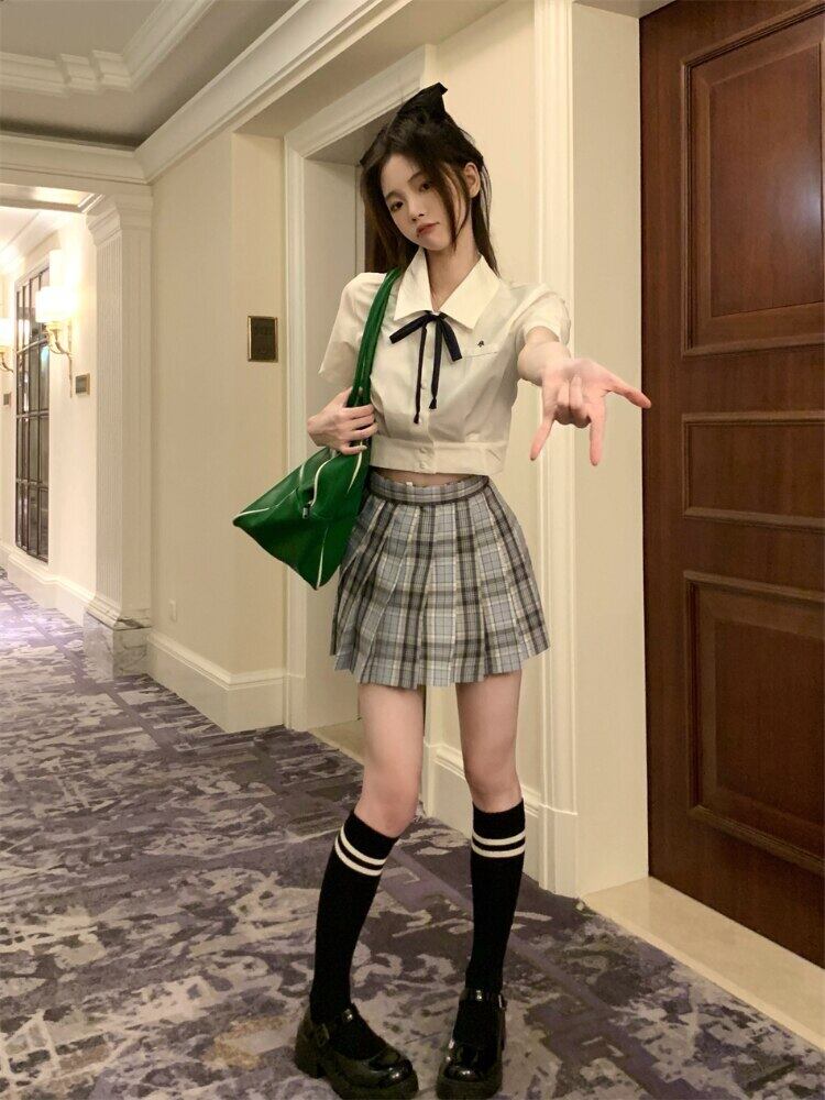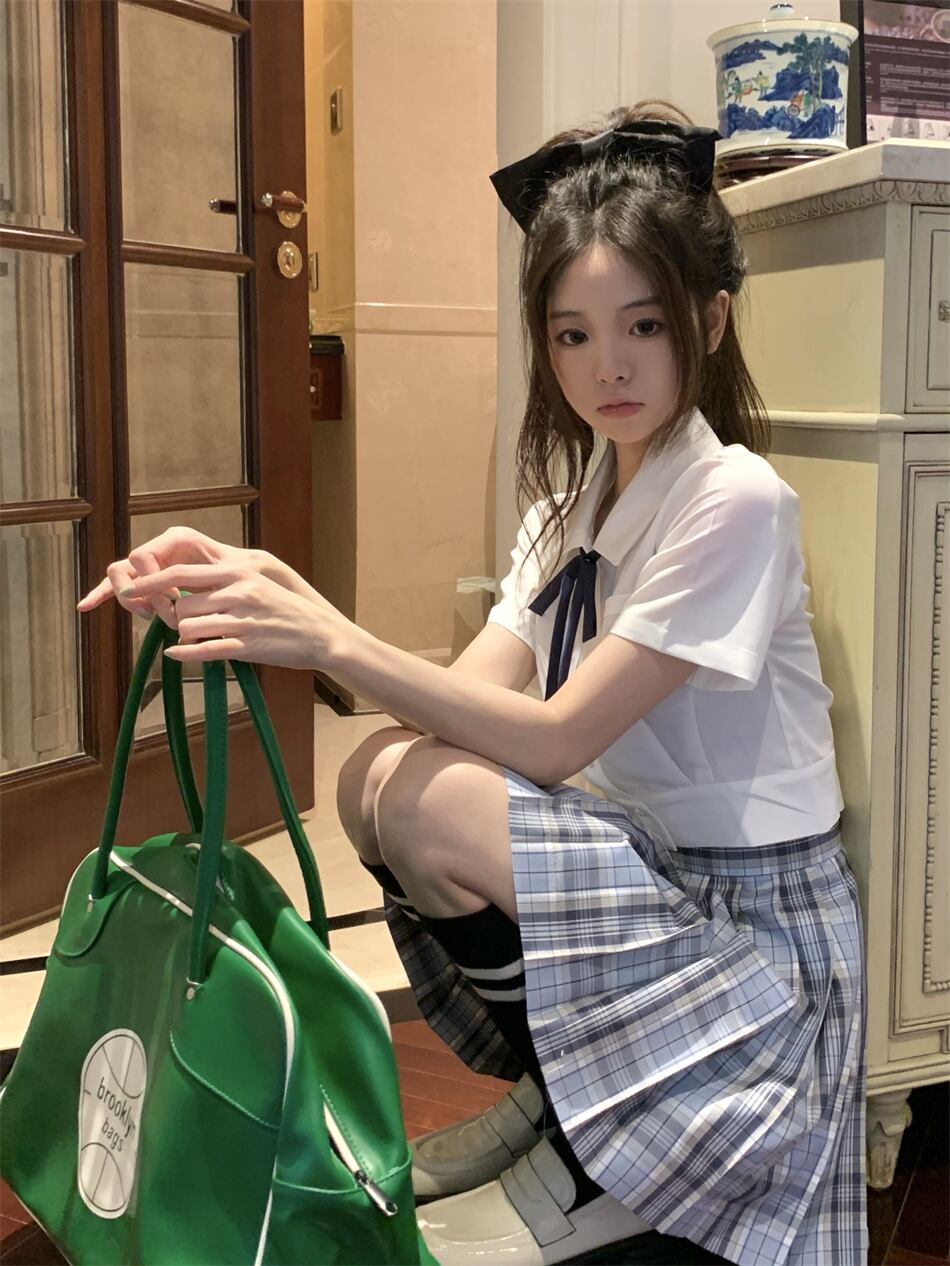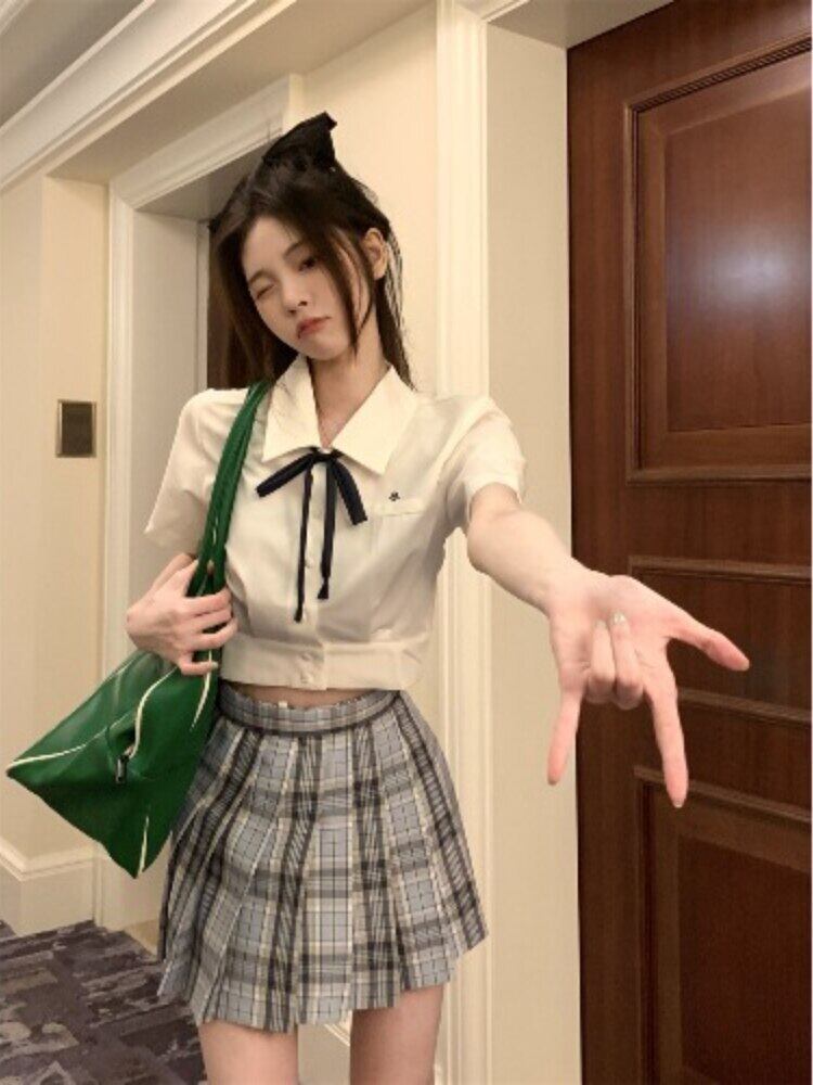 Gothiscyn JK スーツ半袖シャツトップ夏チェック柄プリーツスカート 2 点セットプレッピースタイル衣装 サマー 夏物