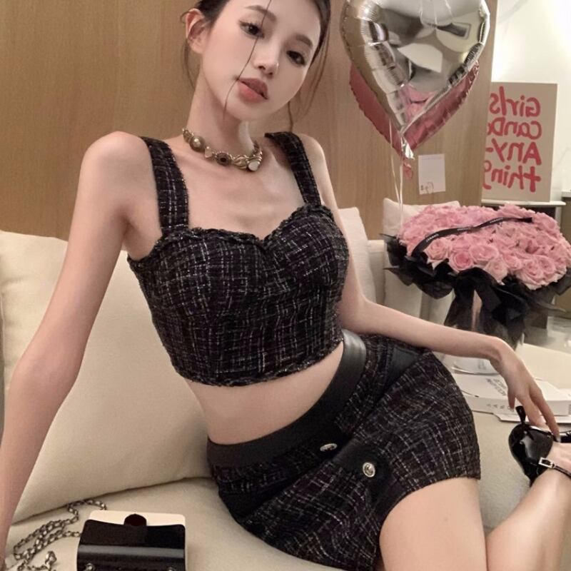 ホットガールスーツサスペンダータンクトップ夏ウエストスリムフィットラップヒップショートスカートツーピースセット Fashioin 服 サマー 夏物