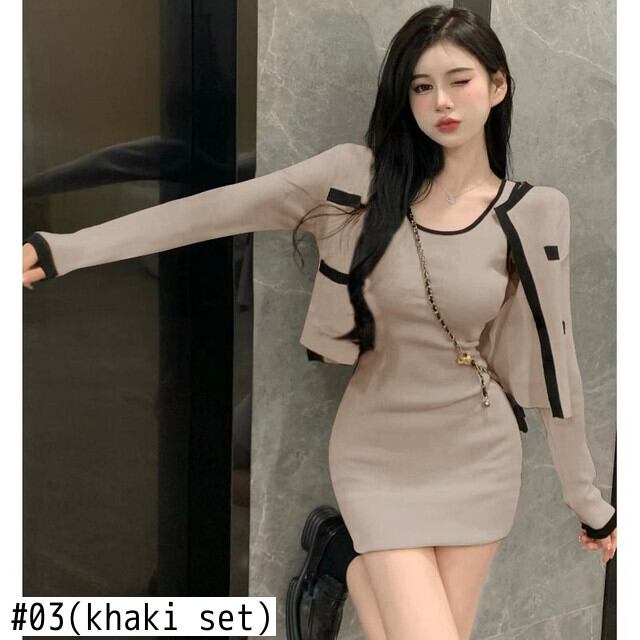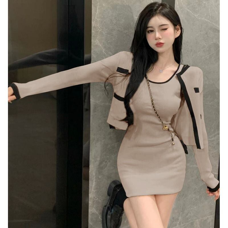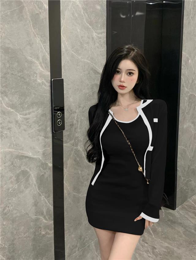 秋ホット女子セクシースーツ長袖 O ネックカーディガンスリムフィットラップヒップドレス 2 点セット服 ロング オータム 秋物 Oネック