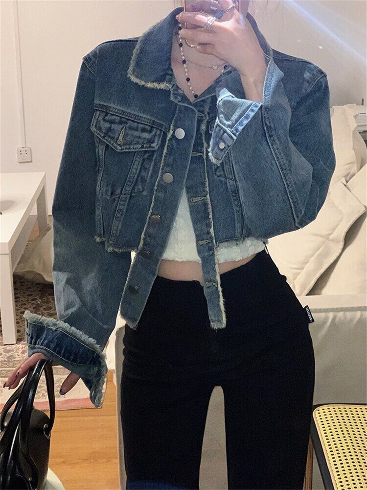 Gothiscyn ホットガールショートデニムジャケット春秋ルーズファーエッジセンスジャケットトップレトロ服コート スプリング 春物 オータム 秋物