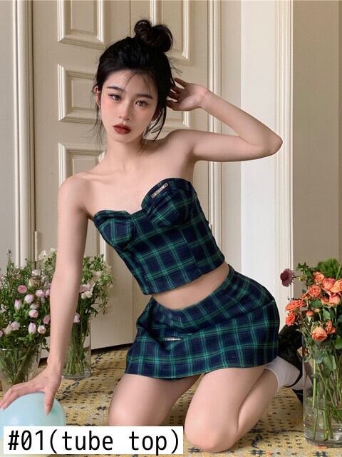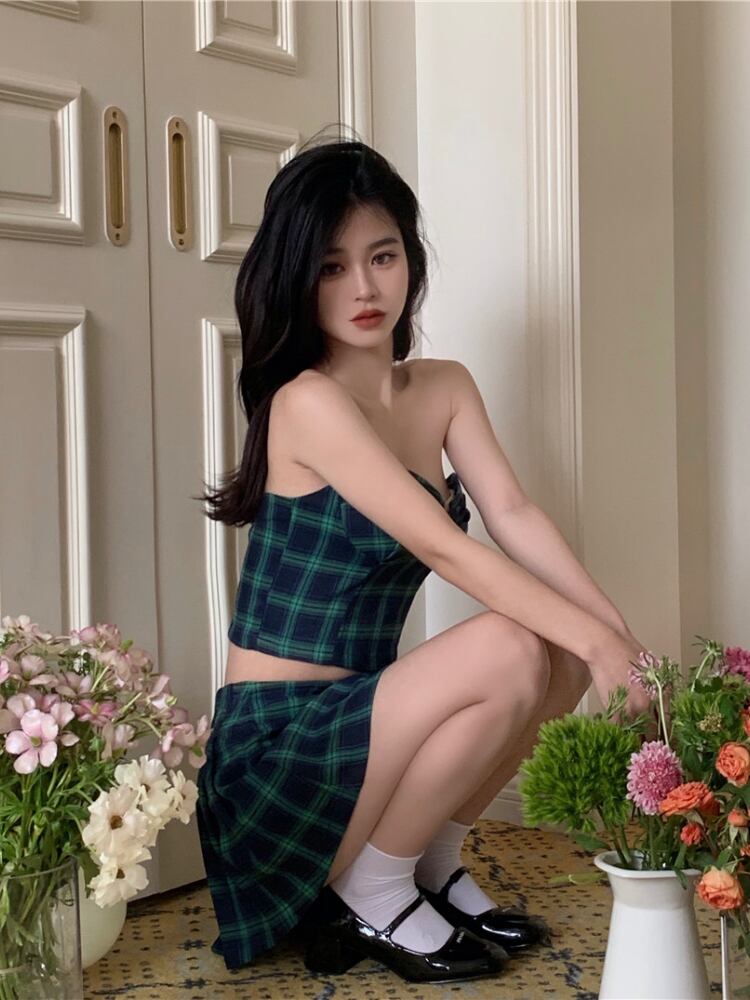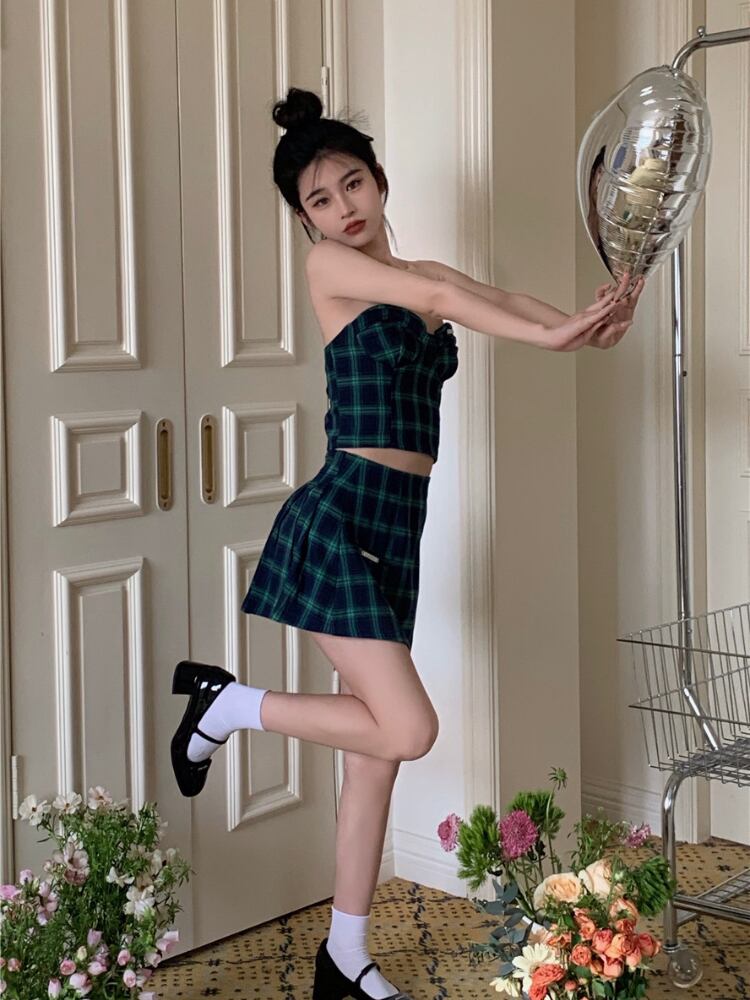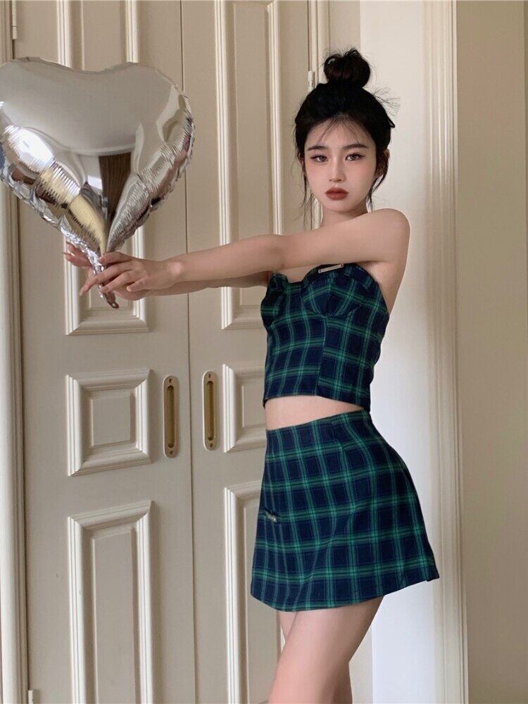Gothiscyn チェック柄チューブトップ + ミニスカートセットウエストレトロ学生バッグヒップ夏 A ラインスカート サマー 夏物 Aライン