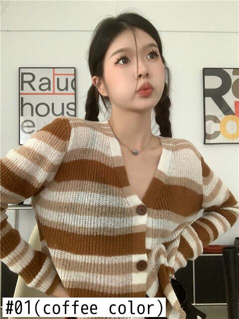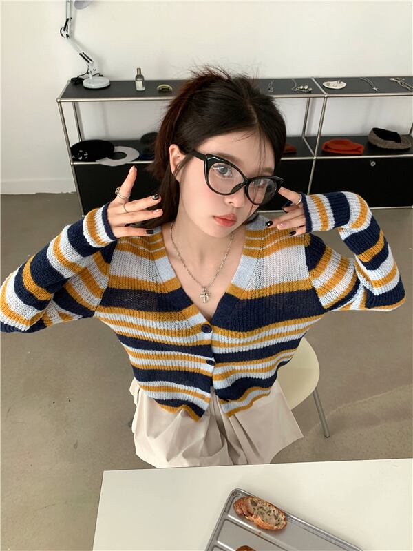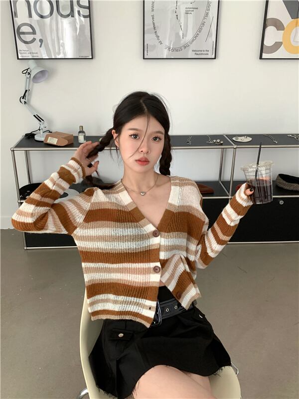 ストライプ薄い V ネック長袖セーター特大カーディガン セーター トップス秋/冬ニット スリム レディース服 ロング オータム 秋物 ウィンター 冬物 Vネック
