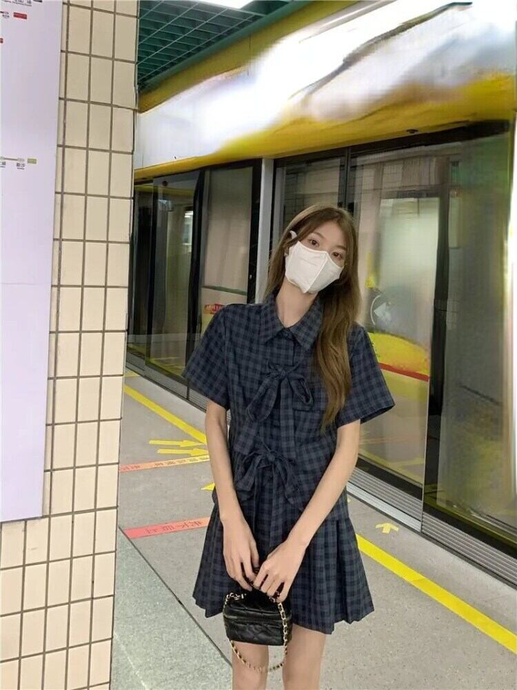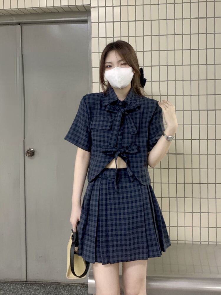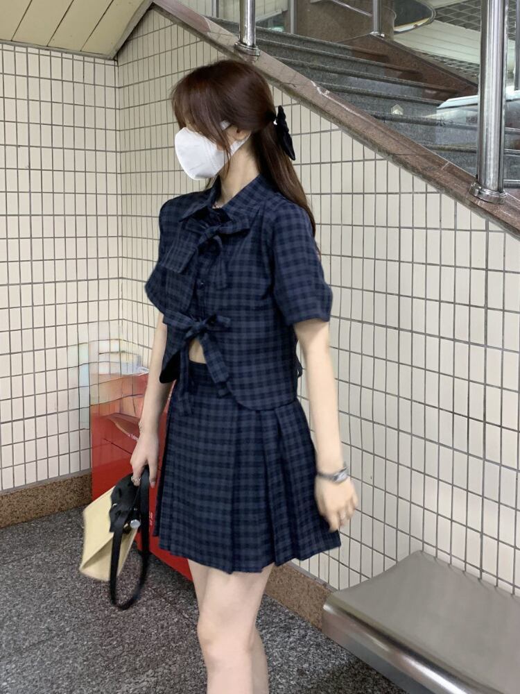 Gothiscyn プレッピー スーツ背中開いた格子縞トップ ウエスト スカート 2 点セット夏優しい甘いブルー スーツ 大人ガーリー スウィート キュート カジュアル サマー 夏物