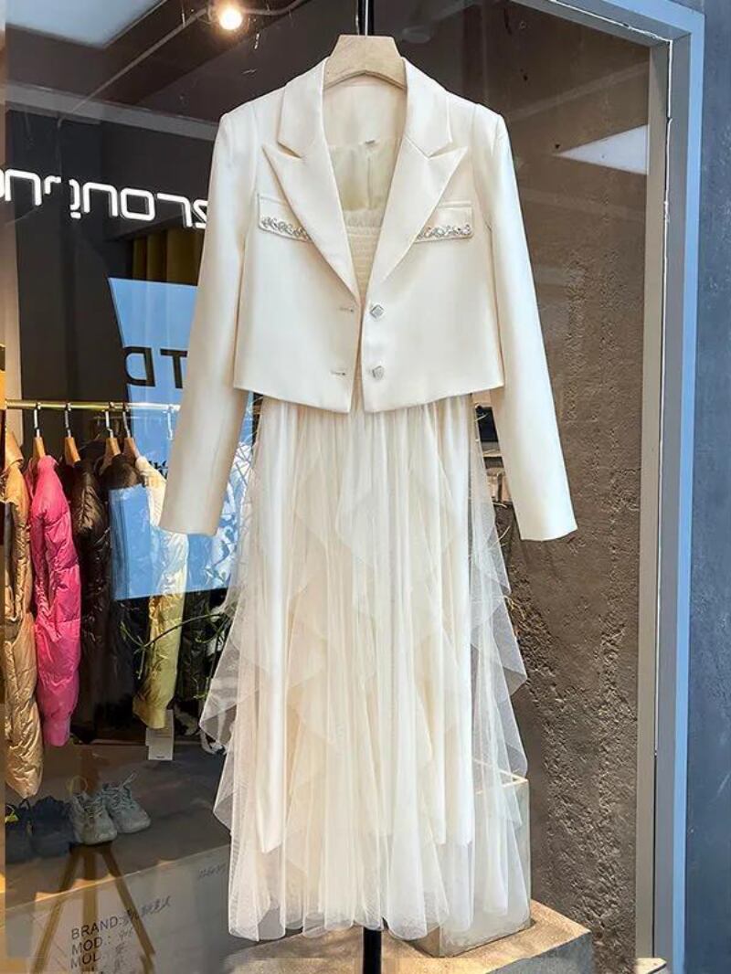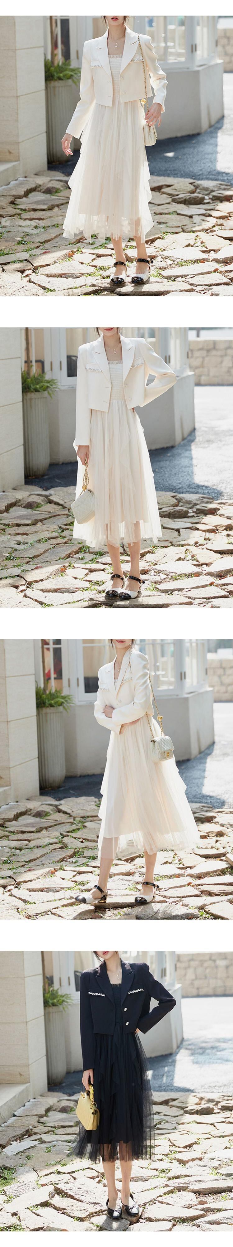 スウィートガールスーツ春長袖ターンダウン襟コートスリムフィットスリムストラップメッシュドレスツーピースセット服 ロング 大人ガーリー キュート カジュアル スプリング 春物