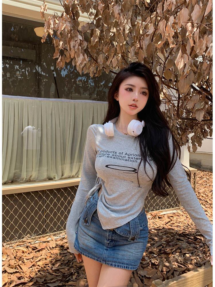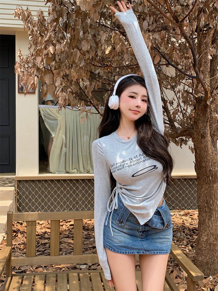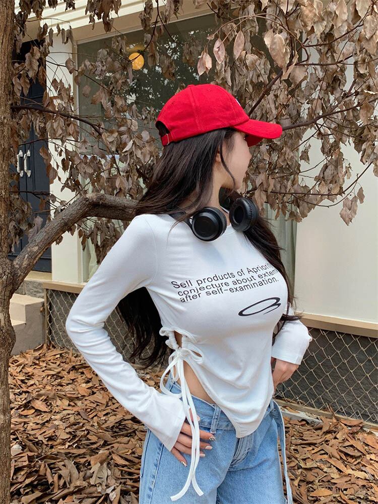 Tシャツレタープリント巾着トップス長袖不規則裾レディース日焼け止めプレッピースタイル中空アウト Tシャツ ロング