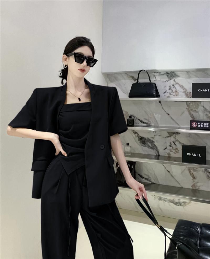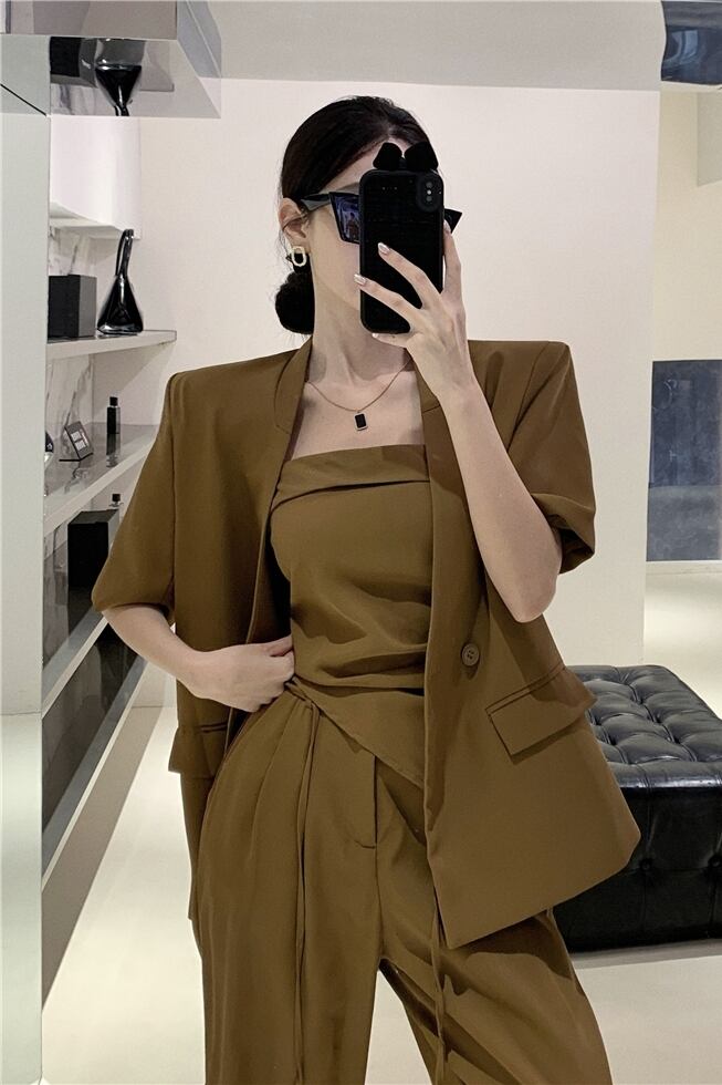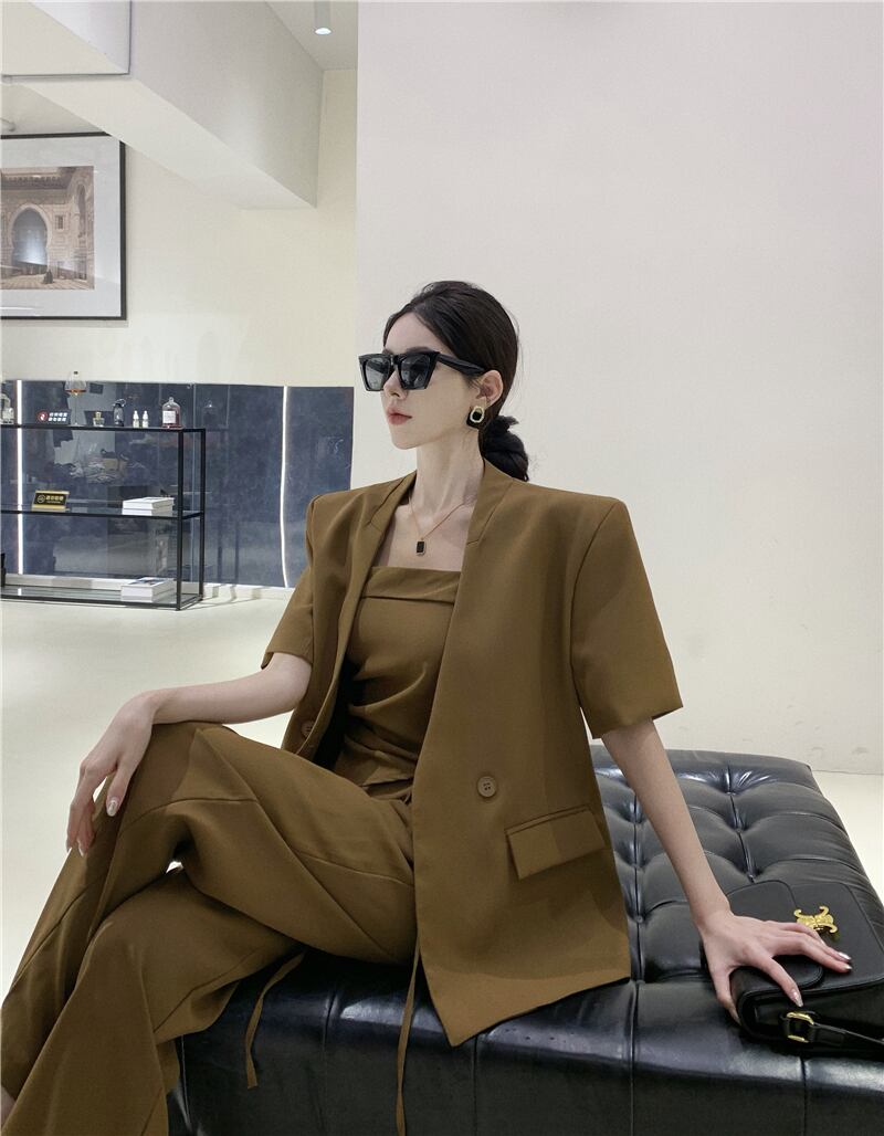 オフィスレディグレードスーツストラップレストップウエストワイドレッグパンツターンダウンカラーコートスリーピースセット服 ワイドパンツ 会社 学校 通勤や通学にも