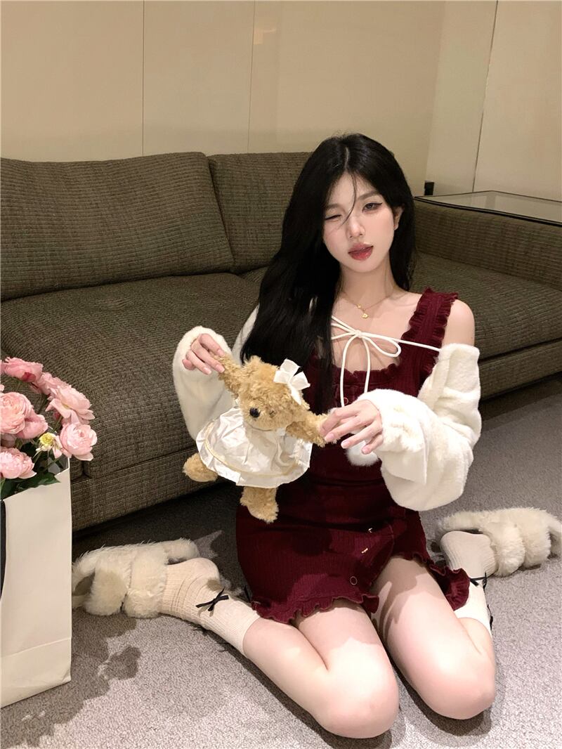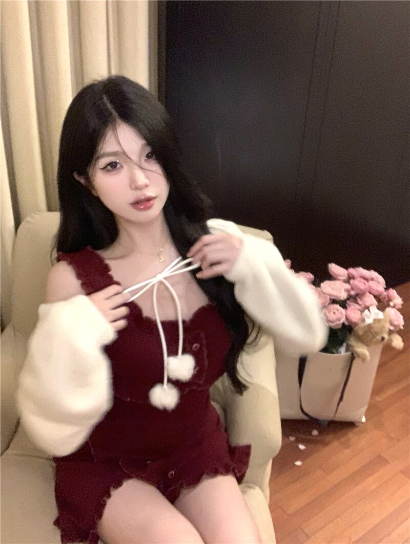 クリスマス レトロ レッド セクシー スリム イレギュラー ウエスト ニット ドレス 冬 子羊 ぬいぐるみ 長袖 ショール 2点セット 服 ロング ウィンター 冬物